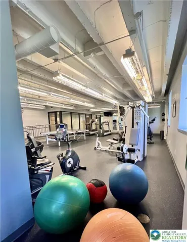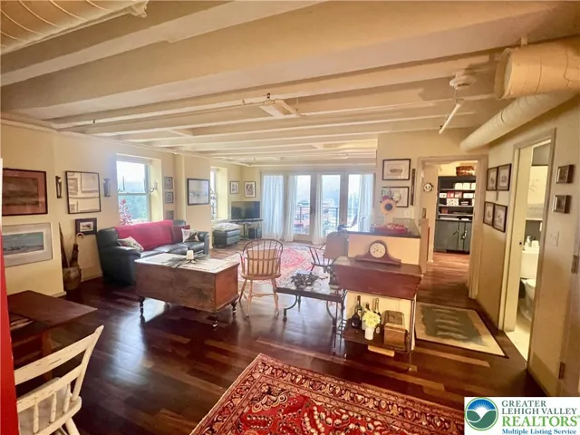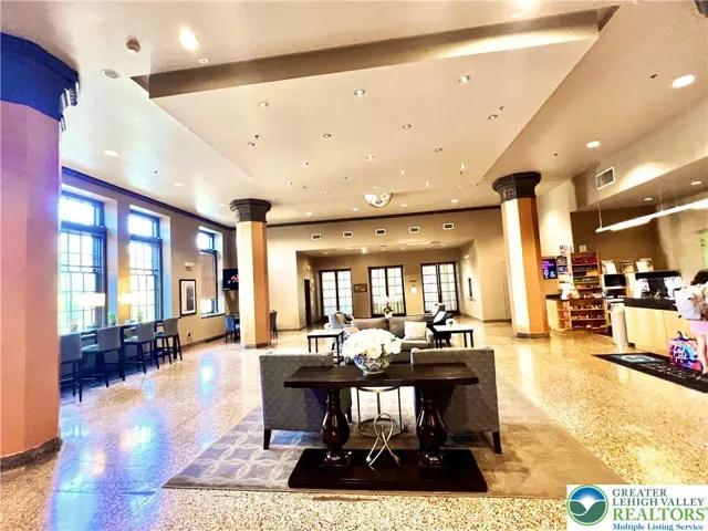 Rare opportunity to own a quintessential luxury loft condo with spectacular panoramic river views, just a stones-throw from NJ, or a few minutes' stroll to NYC bus. This downtown Easton condo features a gorgeous balcony patio with vistas of Lehigh River confluence to the Delaware, multiple bridges, city lights, and rolling mountains. Contemporary, clean, elevated condo design with an open floor plan are within the classic 1920s modern metropolitan 'Hotel Easton' brick walls. Sustainable materials used in the adaptive re-use to include honed granite counters, slate flooring, efficient HVAC systems - utility bill is just electric and water. Private turnkey condo is in its own 4th floor wing. This building is a mix of private condo owners & upscale extended stay hotel suites. Owner has 2 parking spaces in gated lot. Amenities include 24hr. concierge, gym, indoor pool, spacious impressive vaulted lobby & the Gold Room which leads to an outdoor elevated patio that owners may use for events. Condo fees also include trash & recycling pickup (handy, nearby the unit). An elevator ride ports you just steps away from award winning restaurants, artisan shops, farmers market, public market, gorgeous parks, miles of bike trails, a quick jaunt across the 'free bridge' to NJ, and river activities. Enjoy top-notch design, with some of the best views in town. Luxurious low maintenance living in the very heart of historic Easton; live like a Lehigh Valley Rockstar! It's the best of all worlds.