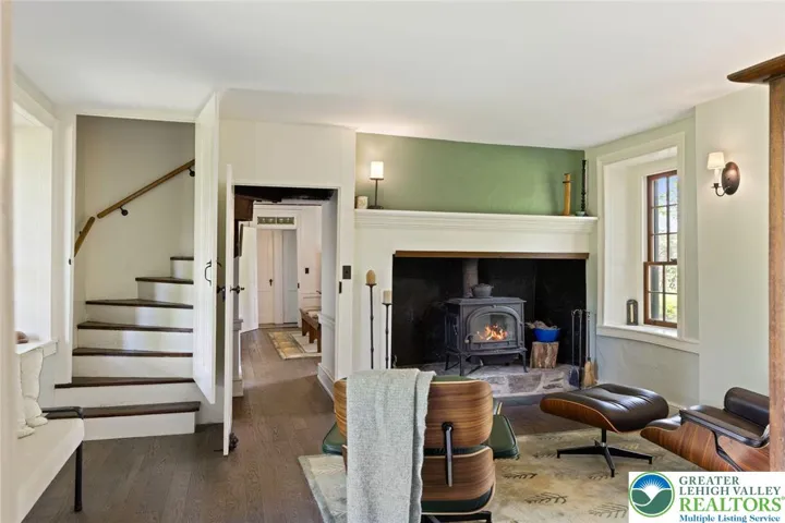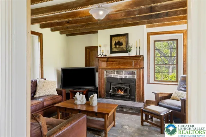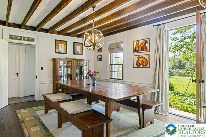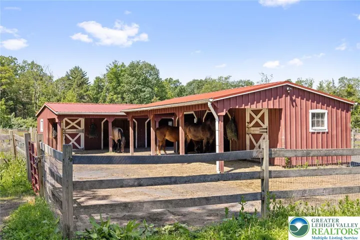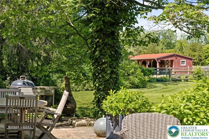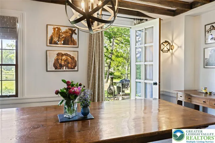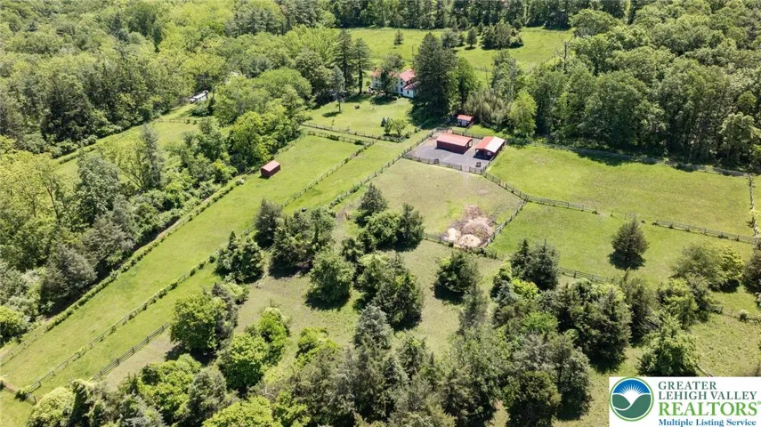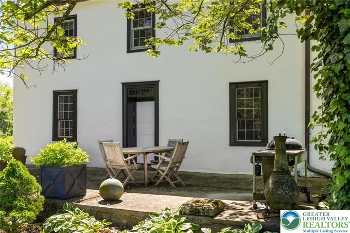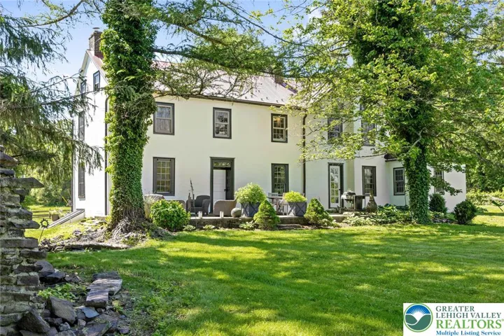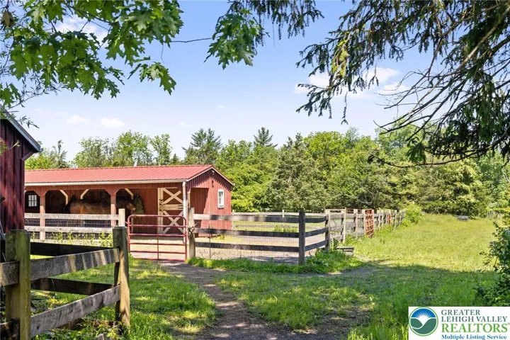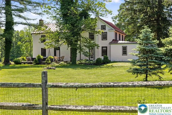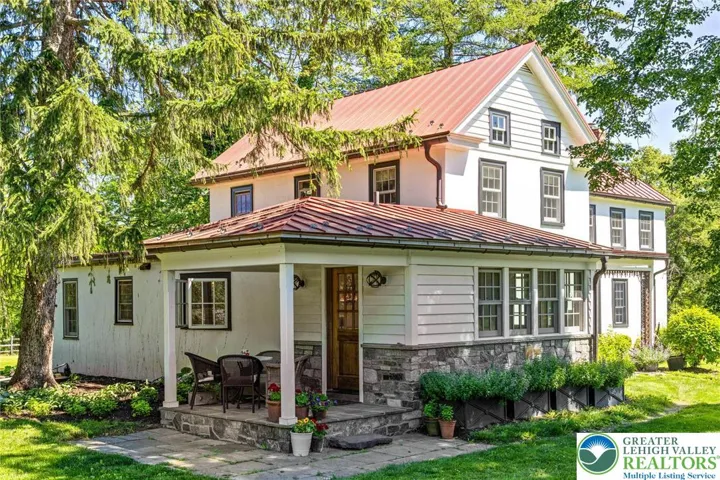 Privately perched atop Kintner Hill and near the Delaware River, this quintessential Bucks County farmhouse offers 80 preserved acres of stunning woodland and pasture, including the 5-acre building envelope; ideal for equestrian pursuits or weekend retreat. The c.1835 plaster-over-stone home retains its original fireplaces, exposed beams, Moravian tile, and pie stairs alongside modern upgrades including radiant heat, Marvin windows, and a beautifully remodeled kitchen with soapstone counters and farmhouse sink, and induction cooking. There are five bedrooms, three updated bathrooms, and several inviting living spaces including a cozy family room with stone fireplace and a sun-filled dining room with a French door to the outdoors. With lovely views in all directions, a charming covered porch, fenced lawn, and 500sf patio complete the home’s connection to its natural surroundings. The stately stone bank barn complements the house. Equine facilities for year-round outdoor living include two stalls, a tack room, three run-in sheds, and over five acres of fenced paddocks. Enjoy riding over two miles of private trails or trailer to nearby Bucks County Horse Park. Includes chicken coop, garden beds, and expansion potential. Just 90 mins to NYC/Philly and near the Delaware River, Lake Nockamixon, and the Lehigh Valley, this home is a rare offering that blends historic charm, pastoral beauty, and tranquility with modern comfort.