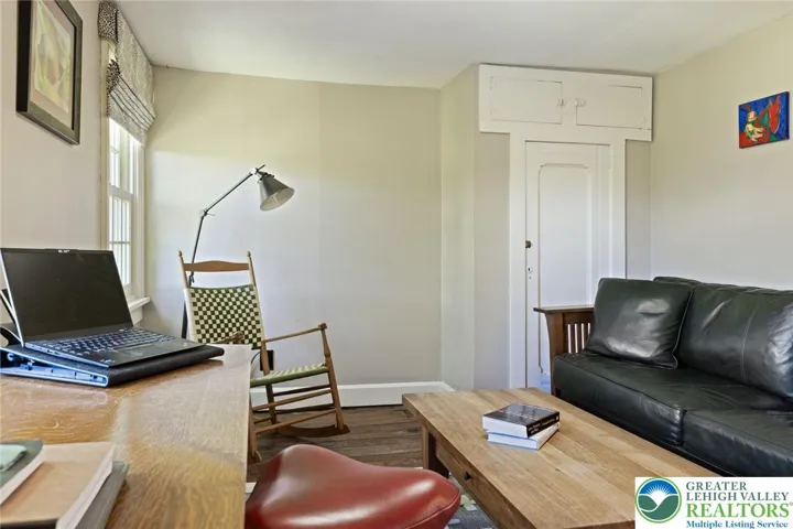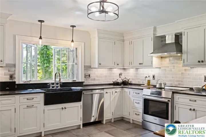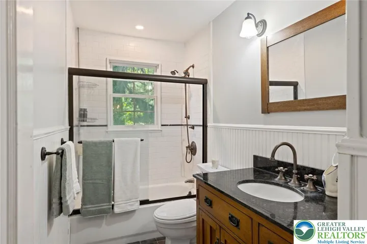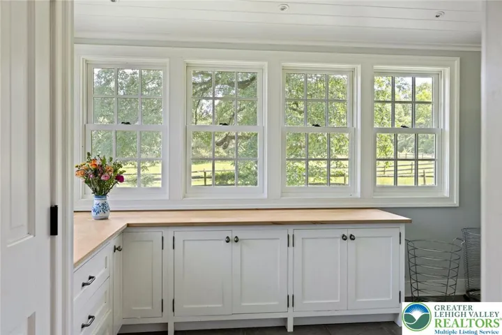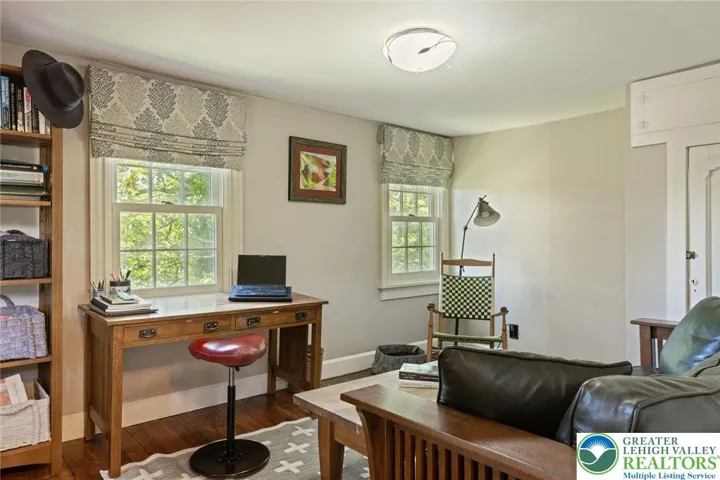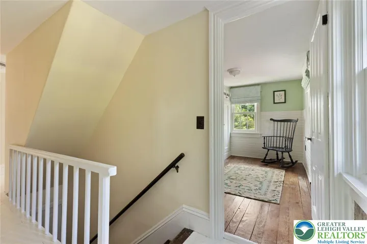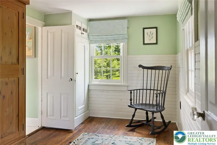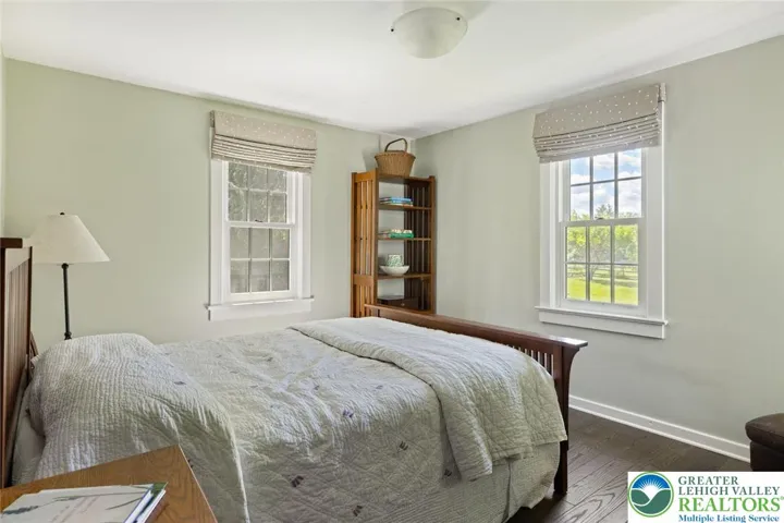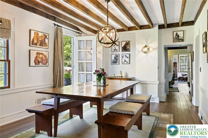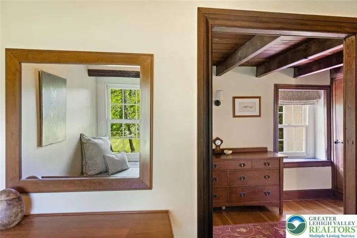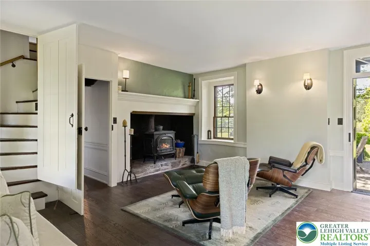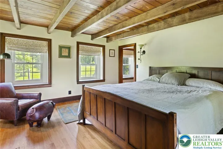 Privately perched atop Kintner Hill and near the Delaware River, this quintessential Bucks County farmhouse offers 80 preserved acres of stunning woodland and pasture, including the 5-acre building envelope; ideal for equestrian pursuits or weekend retreat. The c.1835 plaster-over-stone home retains its original fireplaces, exposed beams, Moravian tile, and pie stairs alongside modern upgrades including radiant heat, Marvin windows, and a beautifully remodeled kitchen with soapstone counters and farmhouse sink, and induction cooking. There are five bedrooms, three updated bathrooms, and several inviting living spaces including a cozy family room with stone fireplace and a sun-filled dining room with a French door to the outdoors. With lovely views in all directions, a charming covered porch, fenced lawn, and 500sf patio complete the home’s connection to its natural surroundings. The stately stone bank barn complements the house. Equine facilities for year-round outdoor living include two stalls, a tack room, three run-in sheds, and over five acres of fenced paddocks. Enjoy riding over two miles of private trails or trailer to nearby Bucks County Horse Park. Includes chicken coop, garden beds, and expansion potential. Just 90 mins to NYC/Philly and near the Delaware River, Lake Nockamixon, and the Lehigh Valley, this home is a rare offering that blends historic charm, pastoral beauty, and tranquility with modern comfort.