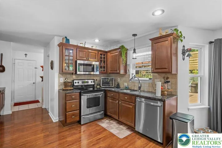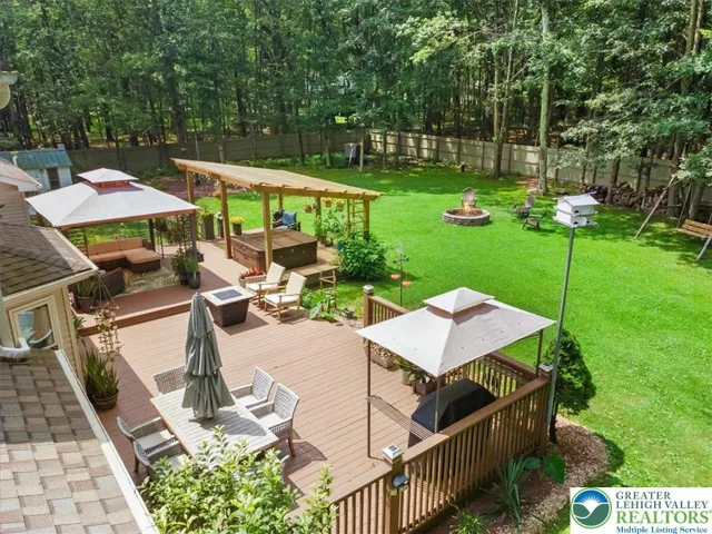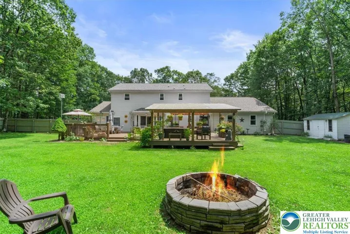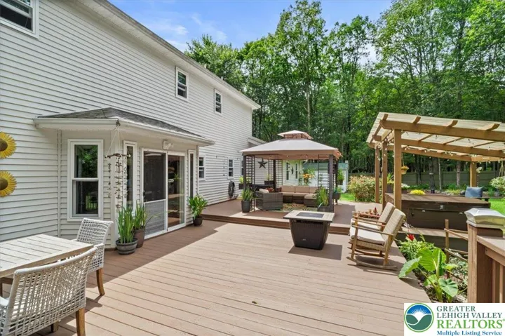 This stunning 4-beds home, with an additional versatile room perfect for a 5th bed or home office, offers the ideal blend of modern living and outdoor serenity. Nestled in a private, wooded setting, the property boasts a large, fenced backyard with a spacious deck, pergola, hot tub, fire pit, smoke house and plenty of room for outdoor gatherings and relaxation. The backyard is beautifully landscaped, featuring numerous plants, adding a lush and vibrant touch to the space. Inside, the open floor plan provides a comfortable space for family, with a welcoming entryway and charming front entrance. The kitchen is updated with SS appliances, dark wood cabinetry, granite countertops, offering both style and functionality. The breakfast nook provides a great view of the backyard and direct access to the deck. The home features 2.5 beautifully updated baths, with impressive, showcasing modern design elements like sleek vanities, stylish light fixtures, and elegant glass-enclosed showers. The master bath stands out with its striking blue tilework, a rainfall shower, and a beautiful vanity, providing both luxury and functionality. Recent updates include a newer roof, windows, and a brand-new heating boiler, ensuring long-term efficiency and comfort. The home also has a whole-house water filtration and softener system for peace of mind. Additional features include a 2-car garage with an attic for extra storage and a convenient storage shed in the backyard. Seller is Real Estate Agent.