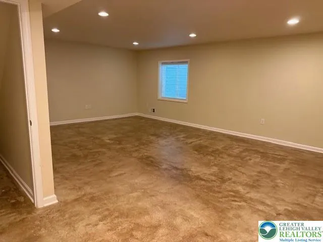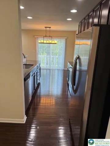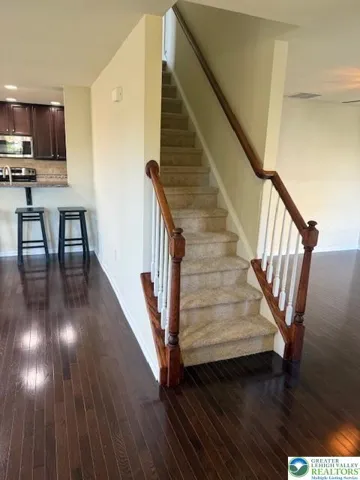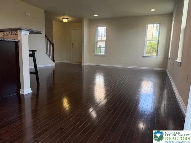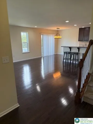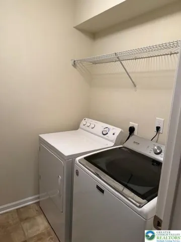 Welcome to 5983 Valley Forge Drive, in the exclusive Liberty Village community in the Southern Lehigh School District. This two-story townhome with a finished basement gives the feeling of being almost brand new with the new carpeting and fresh paint. Hardwood flooring covers the primary living area on the first floor. In addition to a breakfast bar and electric range, the eat-in kitchen features granite countertops and stainless steel appliances. A separate laundry room with a closet is just off the kitchen. As you walk out the sliding door from the kitchen, the rear patio overlooks ample foliage for that feeling of added privacy. The upper floor features three bedrooms, including a master suite with a spacious walk-in closet and a master bathroom with double sinks. Every bedroom features a ceiling fan to enhance air circulation throughout the year.