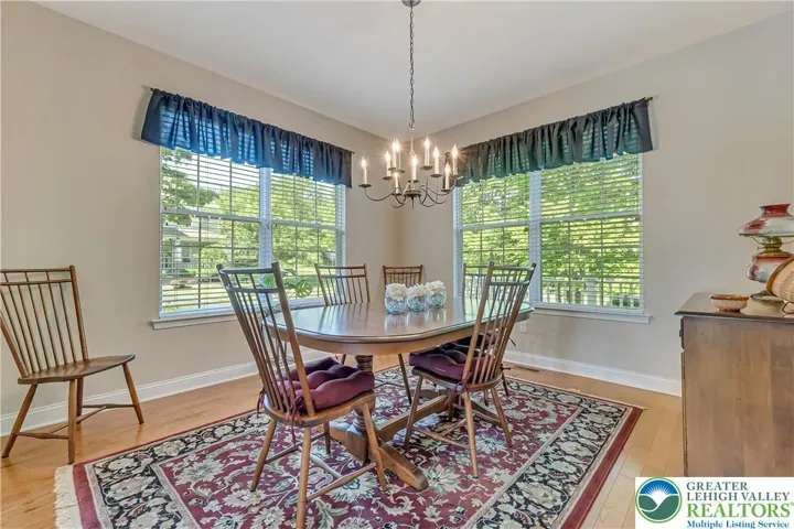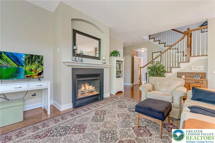 The First Floor Owner’s Suite offers ample closet space and a tranquil retreat. The chef’s kitchen boasts an abundance of cabinets, elegant granite counters, stainless steel appliances, and a spacious pantry—perfect for organizing small appliances and culinary essentials. Every window is adorned with beautiful white custom shutters, allowing for optimal light and privacy. The living room is filled with natural sunlight, creating a warm and inviting atmosphere.