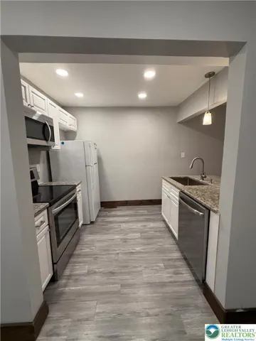 Step inside to a spacious living area that can easily serve as a fourth bedroom. Beyond that, you’ll find another generous living room that flows seamlessly into the kitchen. The kitchen boasts granite countertops, white soft-close cabinets, and a peninsula with stool seating—perfect for casual dining.
