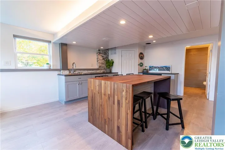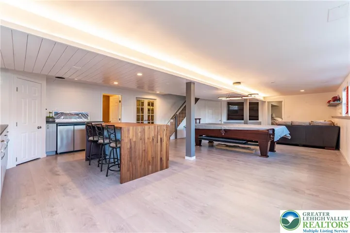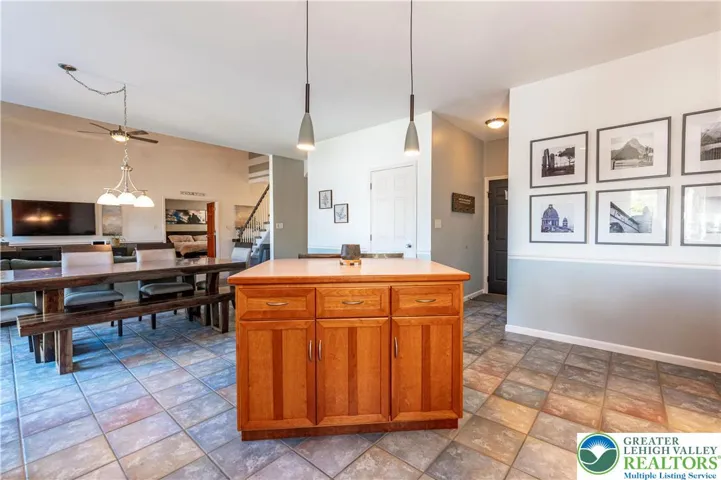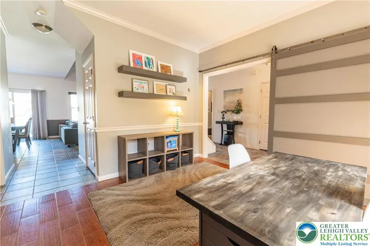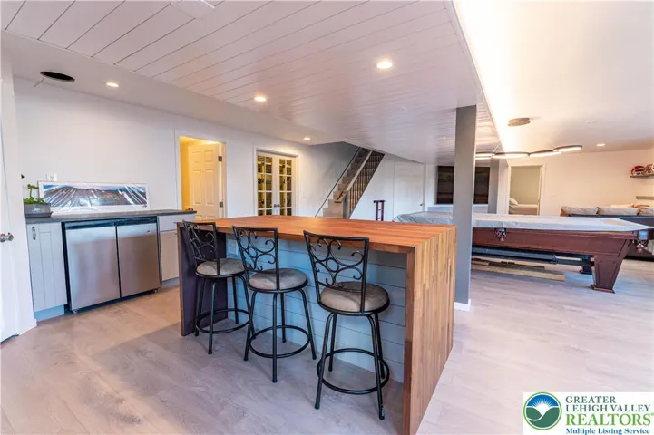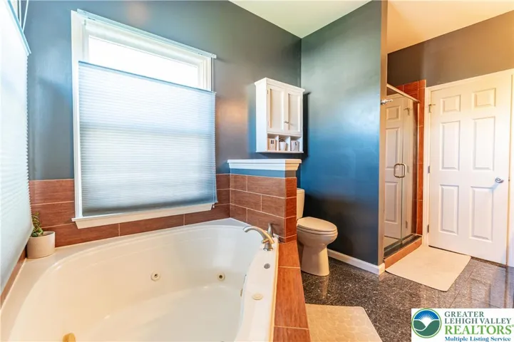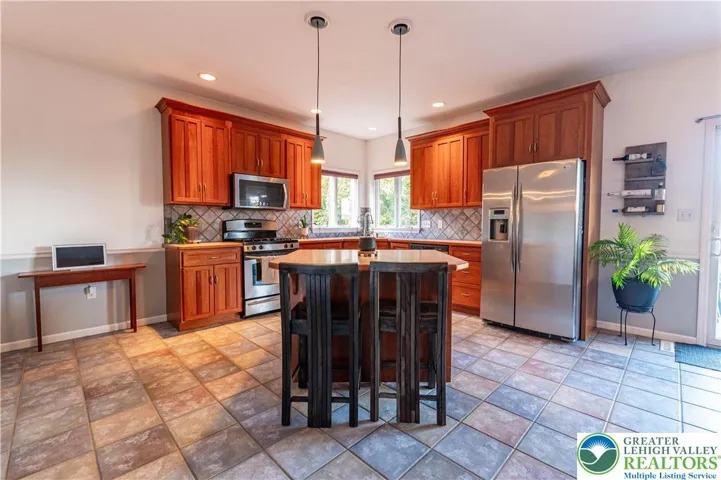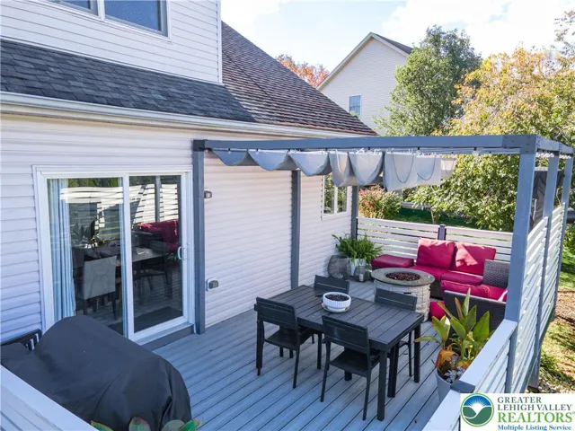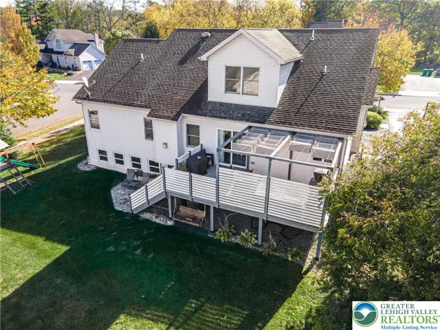 Stunning 4-bed, 3.5-bath stone Colonial situated in a quiet, well-maintained neighborhood! Bask in the bright open flr plan of the main lvl! Step into the tiled foyer leading to a den/home office feat chair rails, baseboard & crown molding, & modern barn dr. The 2-story FR impresses w/plush carpet, vaulted ceiling w/fan & breathtaking flr-to-ceiling stone-front gas fireplace w/rustic mantel & spotlights. The LG eat-in kitchen boasts tile flrs, tile backsplash, stainless stl apps, recessed lts & ctr island w/pendant lights. A pantry & dining area w/deck access complete this cozy space. The 1/2 bath feat tile flrs & vessel sink. Dbl drs lead to the 1st-flr master ste w/wood ceiling beams, wall-to-wall carpet & walk-in closet. The luxurious en-ste bath inc tile flrs, dual sinks, tiled corner jetted tub & tiled walk-in shower w/glass dr. Upstairs, 2 spacious beds w/wall-to-wall carpet share a full hall bath w/tile flrs & tub/shower combo. The finished daylight basement is an entertainer’s dream, feat laminate flrs, shiplap ceiling accents w/recessed lts, LG open rec area w/bar seating, butcher block waterfall counters & kitchenette w/stacked stone tile backsplash. An add'l bed & full bath provide comfort for visiting guests. Enjoy outdr living on the walkout Trex deck w/retractable pergola canopy & slatted privacy walls, or relax on the paver stone patio overlooking a LG yard w/panoramic views. Close to US-22 & PA-33, Bushkill Park, Palmer Park Mall, shops, restaurants & more!