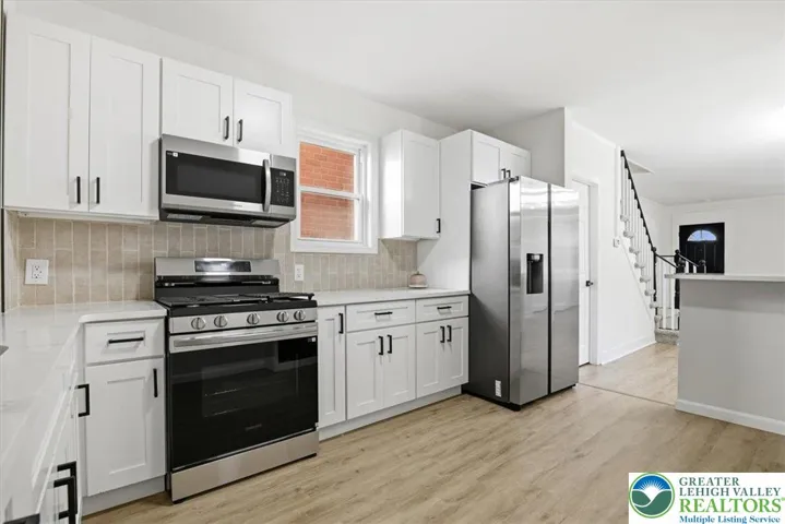 Set on a large fenced double lot, there’s plenty of outdoor space for pets, children, and entertaining. Inside, the open-concept first floor features brand new wood-look LVP flooring throughout the living and dining areas, flowing into the fully updated kitchen with white shaker cabinets, quartz countertops, a stylish tile backsplash, and new stainless steel appliances. Off the kitchen, a foyer area offers access to the backyard and a renovated half bath for convenience.