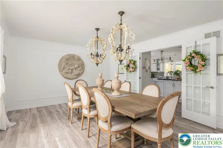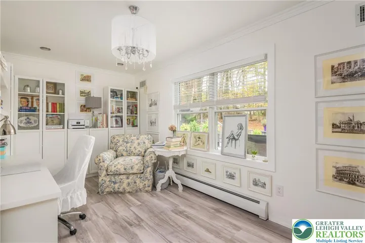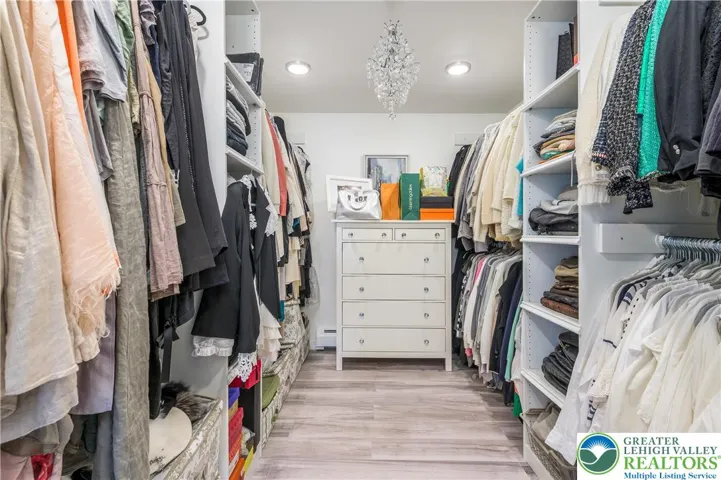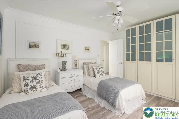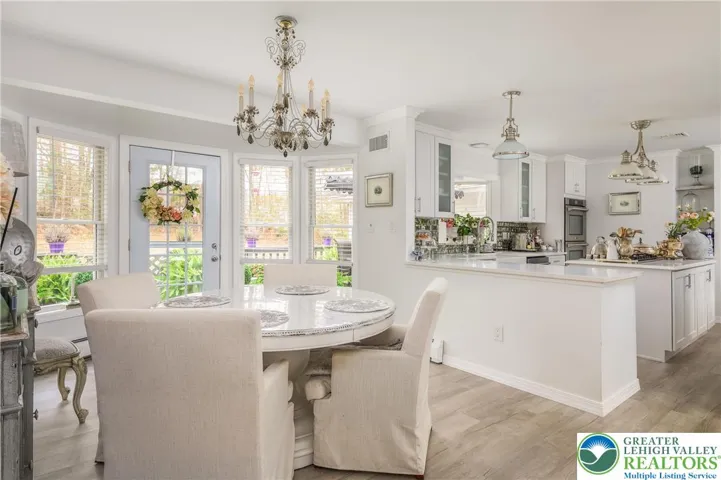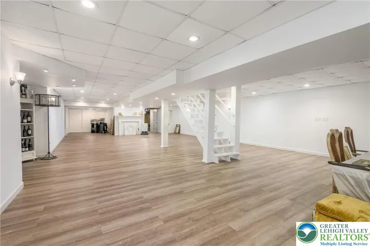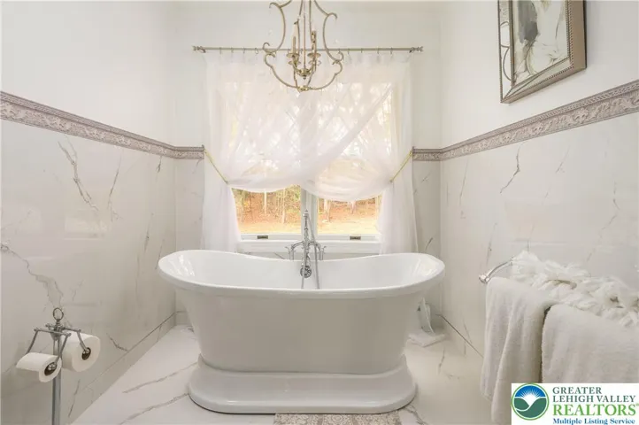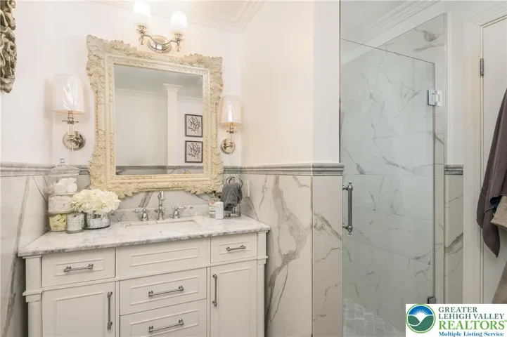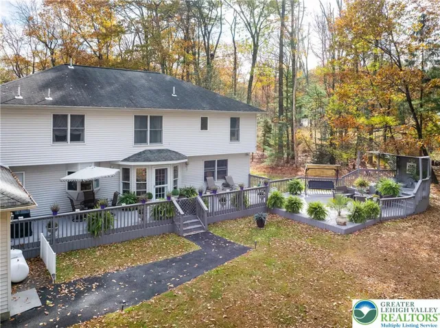 Experience refined living in this stunning, meticulously designed 4-5 bedroom, 3.5 bath brick residence tucked away on a quiet cul-de-sac. Arrive through a circular driveway framed by professional landscaping and a classic fountain, setting the tone for the elegance within. A dramatic two-story foyer welcomes you with natural light and views into the home's beautifully curated spaces. The designer kitchen serves as the centerpiece, offering custom white cabinetry, quartz countertops, premium stainless appliances, and stylish finishes. Enjoy casual meals in the sun-filled breakfast area or host memorable dinners in the formal dining room. The living room and family room, anchored by a warm fireplace, provide exceptional comfort and flow for everyday living and entertaining. The primary suite is a luxurious retreat with a generous walk-in closet and a spa-inspired bathroom featuring high-end finishes and an elevated modern aesthetic. A fully finished lower level expands your possibilities with additional space suited for a variety of household amenities or storage space. Step outside to an expansive deck overlooking a peaceful, park-like yard—ideal for outdoor dining, morning coffee, or unwinding in nature. A two-car garage, abundant storage, and a serene setting enhance everyday convenience. Home also features a whole house UV water treatment system. Prime location places you minutes from I-80 and all local Poconos attractions. One Year Home Warranty included at closing!