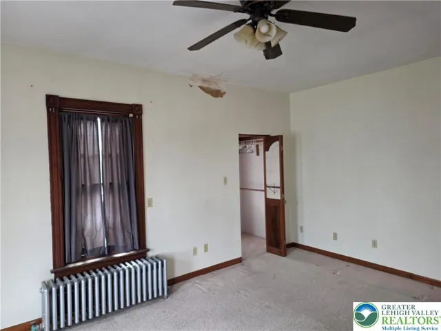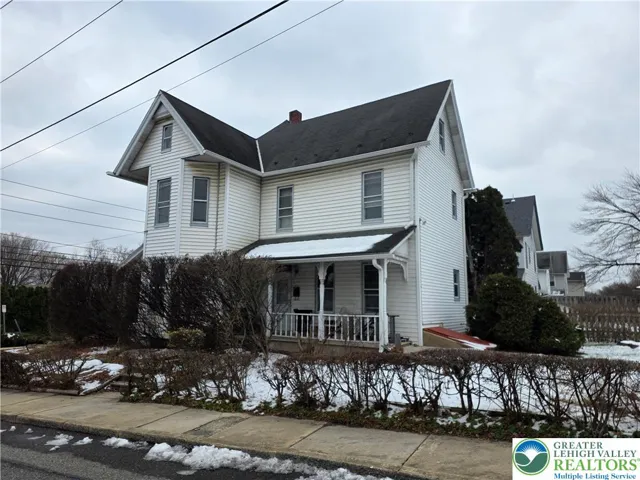 Set on a prime corner lot in Northampton Borough, this two-story single-family home features four oversized bedrooms, two full bathrooms, and plenty of closet space throughout. The floor plan includes a large eat-in kitchen, formal living room, and generously sized dining room, all showcasing historic woodwork, high ceilings, and arched pocket doors with decorative trim.