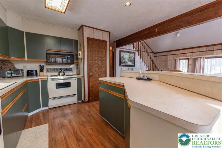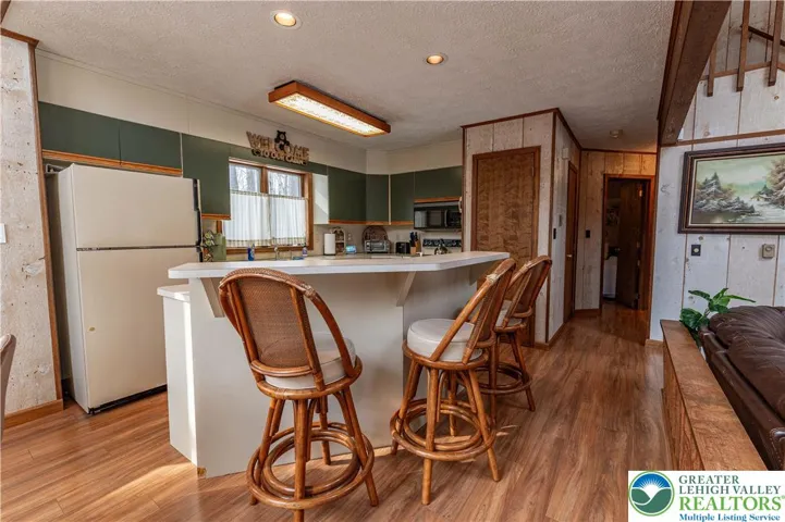 Welcome to this inviting 3-bed, 2.5-bath contemporary home nestled in the scenic Big Bass Lake community. * NEW DUCTLESS HEATING & COOLING THROUGHOUT!* Step inside to a bright open-concept layout enhanced by LVP flrs & rustic touches throughout. The spacious 2-story DR showcases a striking antler chandelier, while the fully equipped eat-in kitchen offers recessed lighting, a pantry, & a bi-level center island w/bfast seating. A step-down FR creates a cozy retreat with its vaulted ceiling, skylights, & a floor-to-ceiling stone wood-burning fireplace accented by spotlights, along w/sliding doors that open to the expansive wraparound deck. 2 generously sized main-floor bedrooms w/ceiling fans share a hallway bath feat a tub/shower combo. Upstairs, a versatile loft w/a ceiling fan overlooks the FR & is perfect for a sitting area or den. The private 2nd-floor primary suite boasts a vaulted ceiling, ceiling fan, & a full bath w/a dedicated tub/shower & commode area. The fully finished walkout lower level expands your living space w/recessed lights, a recreation area, a corner wood stove, & a convenient half bath. Set on 1.46 wooded acres w/beautiful mountain views, this home also offers access to community amenities including trash service, 24/7 security, road maintenance, pools, beaches, basketball & tennis courts, & more—all covered by the yearly HOA fee. Close to major hwys I-380, I-80 & I-476 for easy commute, Tobyhanna state Park, Big Bass Lake, shops, restaurants & much more!