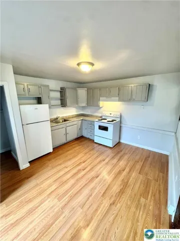 LARGE TWO BEDROOM 2nd and 3rd floor APARTMENT. Unit has been freshly painted and features new carpeting. Enjoy sunny mornings in the oversized eat-in kitchen, plus a bonus office space just off the living room. The second bedroom located on the upper level is a walkthrough. Conveniently located just steps from a laundromat downstairs. Tenant is responsible for electric and trash. One small dog may be considered on a case-by-case basis with a non-refundable pet fee.