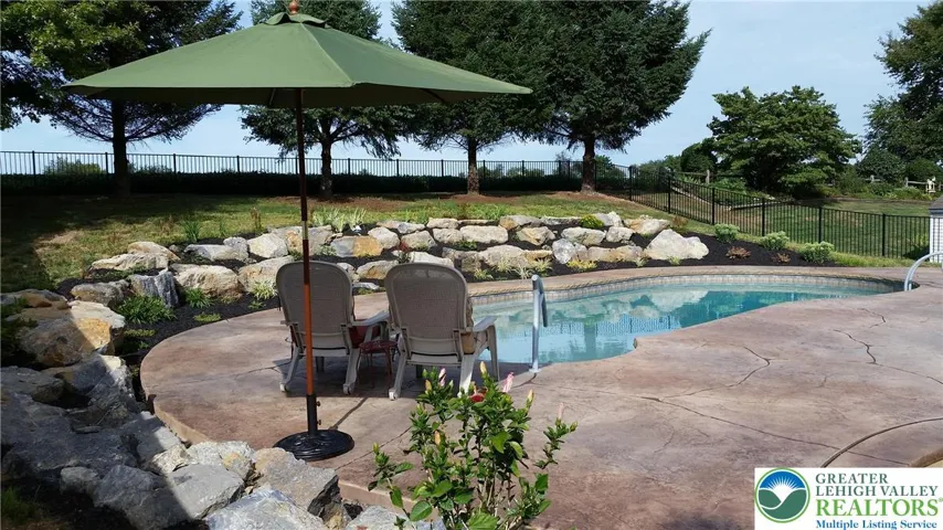 More than meets the eye with what could be your dream home! Located in the Maidencreek community within the Fleetwood School District, this spacious four-bedroom, 2.5-bath two-story offers comfort, style, and exceptional outdoor living. The entry foyer welcomes you into a formal living room and formal dining room accented with chair rail molding. The gorgeous kitchen features recently updated white cabinetry, granite countertops, stainless steel appliances and a breakfast nook. The spacious family room offers laminate flooring, a stone wood-burning fireplace and access to the rear patio. The main level also includes a convenient half bath and laundry room with utility sink. Upstairs, you’ll find four bedrooms and two full baths, including a primary bedroom suite with walk-in closet and a stunning full bath with tile shower. The additional three bedrooms share a full hall bath, along with a convenient linen closet. Your living space is expanded in the finished basement, offering an additional family room ideal for movie nights or relaxing. A private office with walk-in closet makes this space perfect for working from home. Additional highlights include a beautifully landscaped in-ground pool set amidst stamped concrete and enclosed by a fenced-in yard in addition to the covered front porch and rear patio.