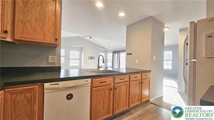 Maintenance free living with convenience! Located in desirable Walnut Bank Farms, this 2nd floor condo provides peaceful community living with easy access to all major routes. Cathedral ceilings, an open concept floor plan and large windows welcome natural light throughout the main living area with spacious living room, separate dining area and open counter height bar seating overlooking the kitchen. The kitchen features plenty of cabinet and countertop space. Adjacent to the kitchen is the laundry room with with washer and dryer in unit for tenant use. The primary bedroom is a true retreat with walk in closet and en-suite full bath with walk in shower. Second bedroom affords a double closet and custom paint, with easy access to the hall bath. Enjoy the fresh air on the spacious balcony. No pets. One year lease preferred.