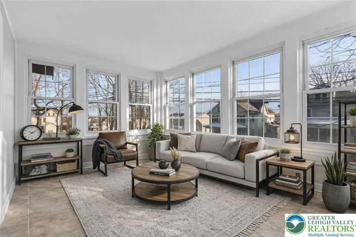 Historic character with modern touches! This charming 4-bedroom, 3 full bath home has been restored and renovated throughout- needs final touches to be complete. Grand 10 ft ceilings on the main floor highlight the open living and dining rooms with large new windows, while French doors lead to the heated four-season sunroom surrounded by windows—perfect as an art studio or a cozy spot for morning coffee. Vaulted ceilings accent the large, new white kitchen featuring a granite island, stainless steel appliances, dual pantry cabinets, and a mudroom with main-floor laundry. Two main-floor bedrooms each offer a full bathroom, while the upper level includes two additional bedrooms and a full bath. The main-floor primary bedroom features an expanded sitting area, walk-in closet, and modern en-suite bath. Built-in one-car garage in the basement, plus unfinished basement storage or workshop space, and 2+ off-street parking spaces. Low taxes. Property being sold AS-IS.