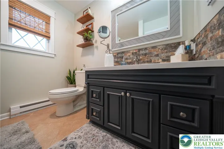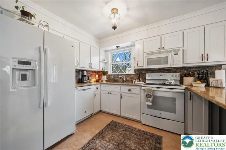 The kitchen is upgraded with granite countertops, stone backsplash, custom cabinetry, soft-close features, and matching GE appliances. The main bathroom has been updated with new plumbing, sink, lighting, and mirror.