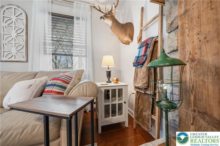 Inside, the home is spotless and fully painted, featuring custom trim, updated lighting, and a striking barn wood fireplace. A Harman pellet stove insert—serviced annually—adds efficient supplemental heat. The home also includes 200-amp electric service.