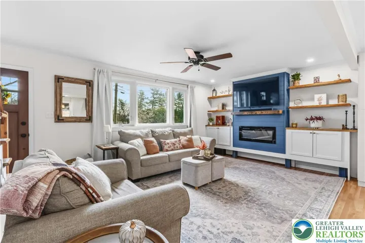 The open living room features custom built-ins and an electric fireplace—perfect for staying warm and cozy. The home offers 4 spacious bedrooms and 2 full bathrooms. The basement includes a comfortable family room with a wood-burning stove, an entertainment bar, and a generous utility/laundry room—ideal for gatherings and relaxation.