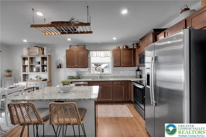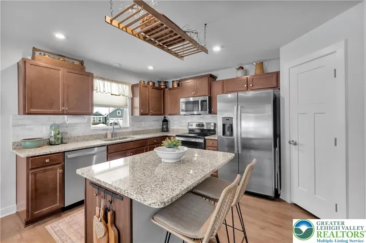 One-floor living at its finest in the desirable Taylor Villas 55+ community. This beautifully appointed home offers the perfect balance of space, style, and low-maintenance comfort. The bright, open floor plan is filled with natural light and thoughtfully designed for both everyday living and entertaining. The kitchen features granite countertops, a tile backsplash, stainless steel appliances, a center island, a nicely sized pantry, and abundant cabinetry with pull-out drawers for exceptional storage. The kitchen flows seamlessly into the sun-filled dining area and spacious living room. Luxury vinyl plank flooring enhances the foyer, hallways, kitchen, and living areas, while tile baths add durability and style. The flexible layout includes three bedrooms, a full hall bath, and a convenient laundry/mudroom with tile flooring, a utility sink, and additional cabinetry. The oversized primary suite offers a generous walk-in closet and a beautifully appointed en-suite bath featuring dual sinks and a built-in shower seat.