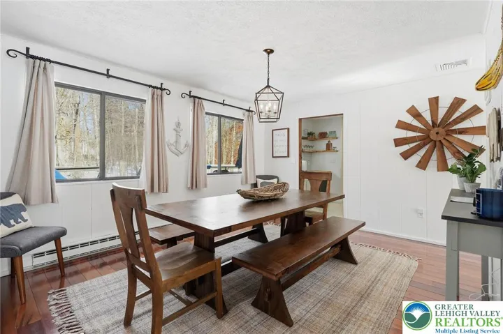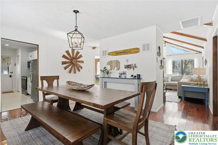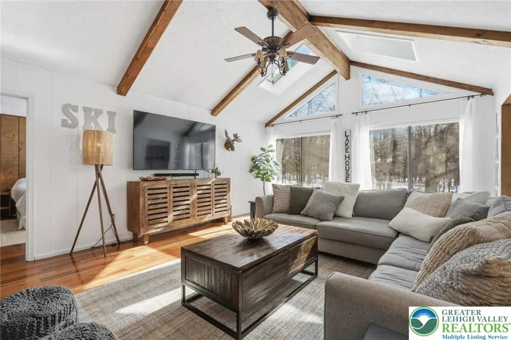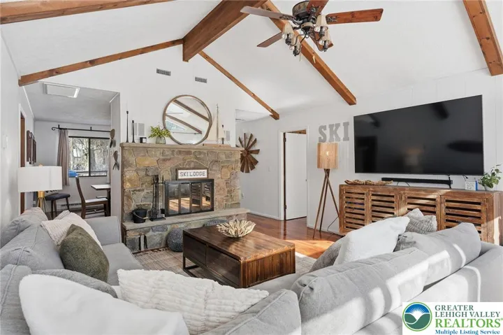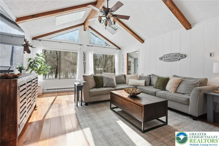 WOW! Fantastic home in the Timber Trails community! Tucked into its own wooded retreat, this 3-bedroom, 2-bath ranch style home offers privacy, character, and that classic Pocono feel. Inside, you’ll find beautiful hardwood floors and unique barn wood accents that add warmth throughout the home. The foyer opens into a light-filled living room with cathedral ceilings and a stone-surround, wood-burning fireplace—perfect for cozy nights in.