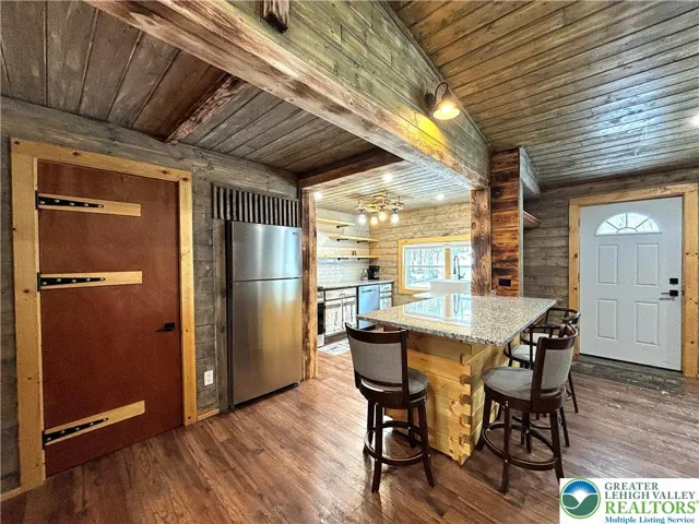 Enter your dream CABIN on almost acre of land! This COMPLETELY RENOVATED and FULLY FURNISHED MOUNTAIN RETREAT with oversized private back DECK ready for summer grilling and entertaining friend. You are gonna love the detaled design: with rustic wood planks thougout the place, wood stove, custom finishes in every room including bathroom, kitchen with farmhouse sink and more. Don't forget the garage with finished space above that could be used for office, workshop or anything you desire. Great opportunity to own get away place. Close to: Mt. Airy Casino, minutes away from all Poconos water parks: Kalahari Resort, Camelbeach, Aquatopia, Camelback Ski resort, state parks, water sports, hiking, fishing, hunting, horse back riding.No transfer title or HUD label avialiable for the mobile home, sold via bill of sale.