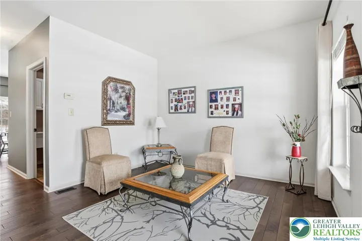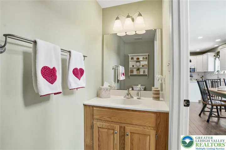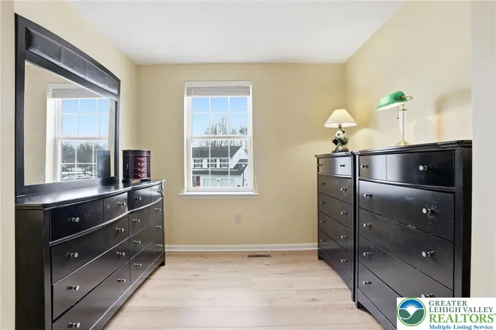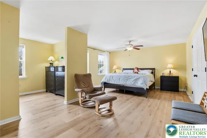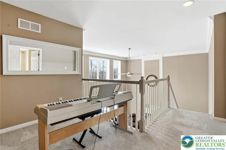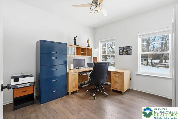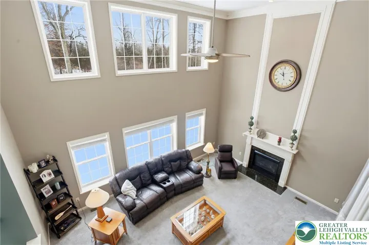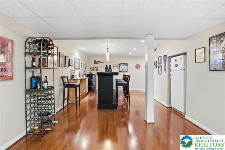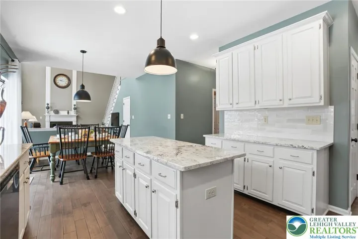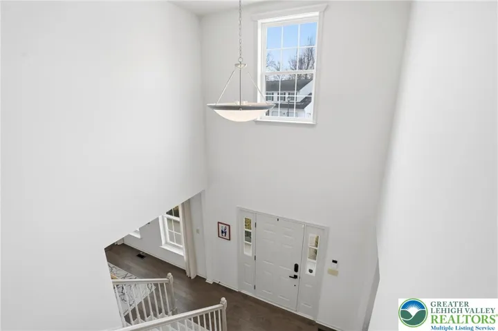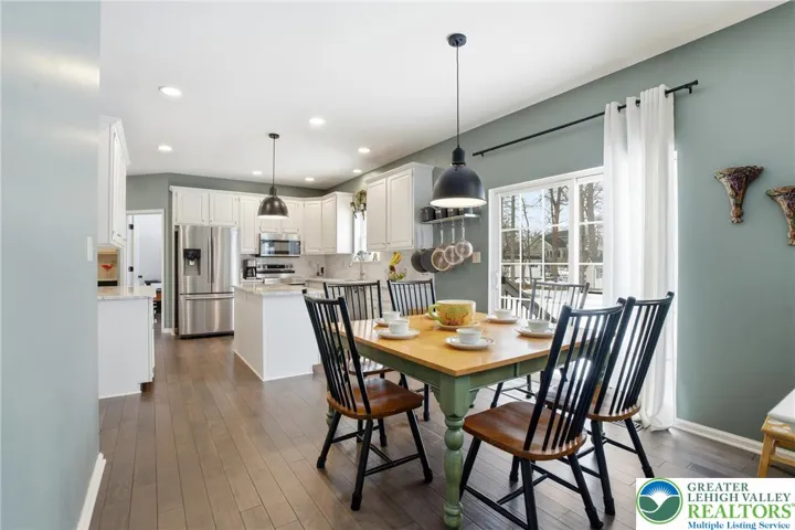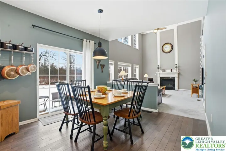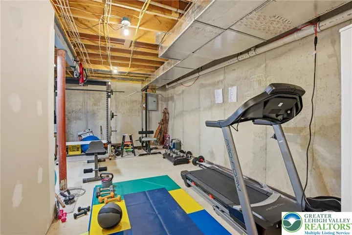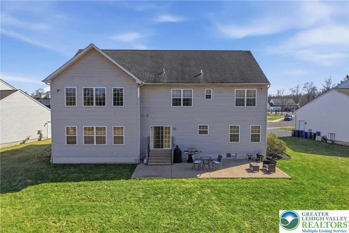 This expansive 4,100 sq. ft. residence in Quakertown, Bucks County, built in 2003, offers a harmonious blend of comfort and functionality across three finished floors. This flexible 4–5-bedroom, 3.5-bath layout includes four traditional bedrooms, plus a main-level den that can easily serve as a 5th bedroom, and an impressive approx. 600 sq. ft. primary suite. An economical gas-forced-air heating system, gas-powered domestic hot water, gas fireplace, and central air conditioning provide efficient year-round comfort. The heart of the home is a modern kitchen featuring white cabinetry, granite countertops, and stainless steel appliances. Large windows fill the space with natural light and provide picturesque views of the surrounding landscape. Open to the kitchen, a spacious two-story family room with soaring ceilings and a gas fireplace creates a warm, inviting space for everyday living and entertaining. Adjacent to the kitchen is a welcoming dining area and a separate dining room, an ideal setting for everyday meals or hosting dinner parties. The bedrooms are designed for comfort, with generous closet space and warm finishes. One bedroom features light wood flooring, a ceiling fan, and soft yellow walls that create an inviting atmosphere. A dedicated laundry room with top-loading appliances and ample storage simplifies household chores and keeps everything organized. The expansive finished basement offers exceptional bonus space, including a dedicated game room with a pool table, a bar area, an exercise area, and a home theater space, all with carpeted flooring and recessed lighting for a cozy ambiance. Basement furniture and the pool table may remain, adding immediate value and convenience. Storage is plentiful throughout, including a walk-in closet with extensive hanging space for a well-organized wardrobe, as well as additional closets and utility areas. The bathrooms are tastefully appointed, with one featuring built-in shelving and charming decor touches that enhance both style and function. Outside, the property features a rear patio and a yard that backs to a borough-owned green space, offering a pleasant backdrop and a sense of openness beyond the approximate 17,000 sq. ft. (about 0.39 acre) lot. An attached two-car garage provides convenient parking and additional storage. Large windows throughout the home provide abundant natural light and views of the surrounding area, while hardwood floors in many rooms add warmth and character. With its balance of open gathering areas and private retreats, efficient gas utilities, central air, finished lower level, attached garage, and rear yard adjoining open space, this thoughtfully designed 2003 residence is well-suited to modern living in Quakertown.