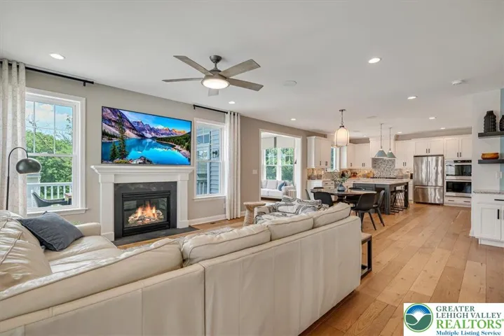 The main living space unfolds into a beautifully designed open layout, featuring rich engineered hardwood floors and a cozy gas fireplace. The chef’s kitchen anchors the home with a spacious center island, stainless steel appliances, and a bright dining area, all seamlessly connected for effortless gathering. Just beyond, a sun-filled sitting area offers additional space to relax and unwind.