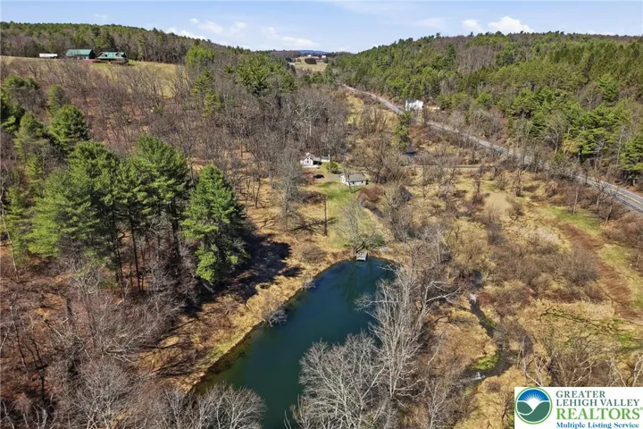 Rare opportunity to own 39.683 acres of scenic land featuring a private pond, Hunter Creek running through the property, and extensive road frontage along Spruce Hollow Road. The property offers a beautiful mix of wooded acreage and open areas, creating a private and peaceful setting with excellent usability. A small cabin-style ranch home with loft (approximately 560 sq ft) is situated on the property along with multiple outbuildings, including a detached garage and storage sheds. The existing structures are modest and the property is best suited for those looking to renovate or utilize as a recreational retreat. Very close to Blue Mountain Ski Resort! A private bridge provides access into the property, opening up to expansive acreage with depth and versatility. With over 1,300 feet of road frontage and the natural water features of both a pond and Hunter Creek, this property offers a unique outdoor setting ideal for recreation, nature, and privacy. A truly special setting combining acreage, water features, and seclusion—hard to find in today’s market. Roof installed 2022. Low Taxes! Property is being sold as-is.