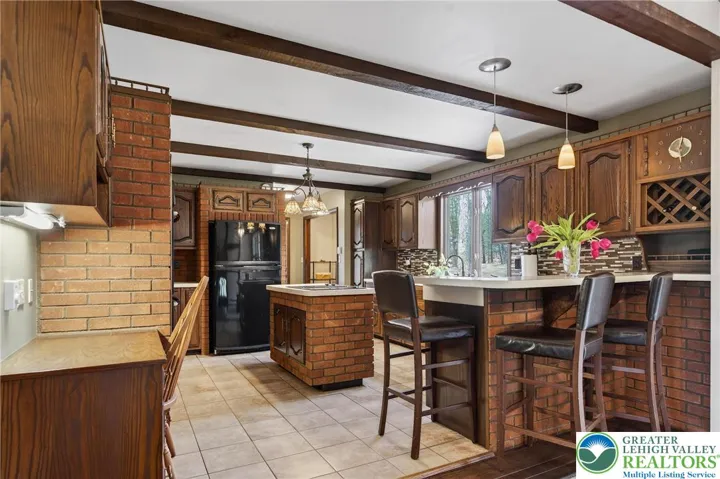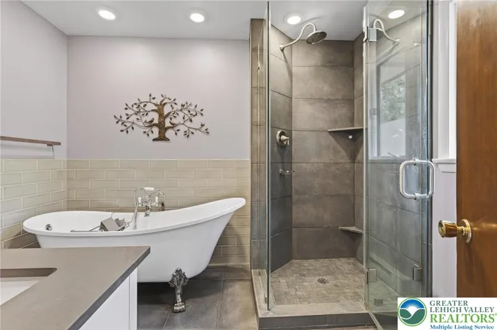 Seller has accepted Offer. A woodland setting with convenient access to Route 309, this home offers you a retreat with convenience in a lovely property and spacious home. The façade perfectly blends with the sylvan surroundings and guides you into the home’s foyer flowing into the dining area to the rear, both sitting beneath a 12’ peak timbered cathedral ceiling. The formal living room one step down to the left is spacious and calm, a bow window overlooking the expansive front yard. The home’s kitchen offers an abundance of space for work or gathering with double wall oven, island with cook top, two-tier peninsula with breakfast bar, and a window above the sink overlooking the back yard and woodland beyond. A mud room, opening to a rear covered porch, and attached two-car garage complete the main level. Upstairs, three well sized bedrooms, a spacious primary with double closets, are served by an immaculate full bath boasting a claw-foot soaking tub, double vanity, and beautiful tile surround corner shower, with glass walls and door offering an open feel. The lower level offers an abundance of additional living space beginning with a family room, wood paneled walls and beamed ceiling pair with the stone surround wood-burning fireplace to make this a wonderful gathering space filled with warmth and charm. A fourth bedroom as well a second full bath, which also houses the home’s laundry, complete this lower level. The lowest level of the home offers a marvelous recreation room with beautiful built-in bar and ample bar-back storage, as well as further built-in shelving and cabinetry to the far end all presented in beautiful wood paneling. A private office to the rear of the home connects to the utility and storage space on this level, this room connecting via stair to the garage above. Outside, the mature trees surrounding the clearing for front and back yards, a rear covered porch and two-tiered stamped concrete patio offer ideal outdoor living spaces! A detached one-car garage offers abundant room to store outdoor equipment! With over 1.3 acres outside and over 2600sf within, this is a property which perfectly blends charm and space.