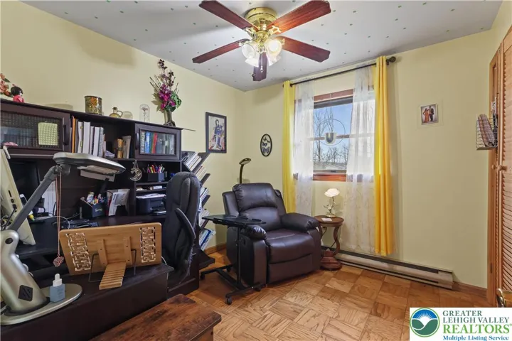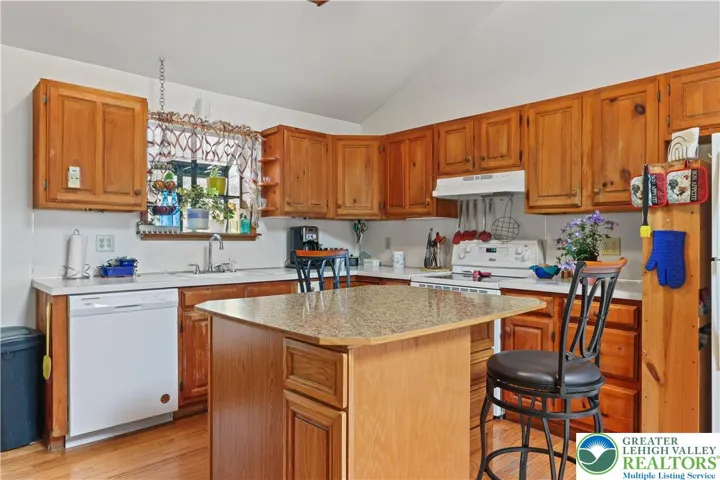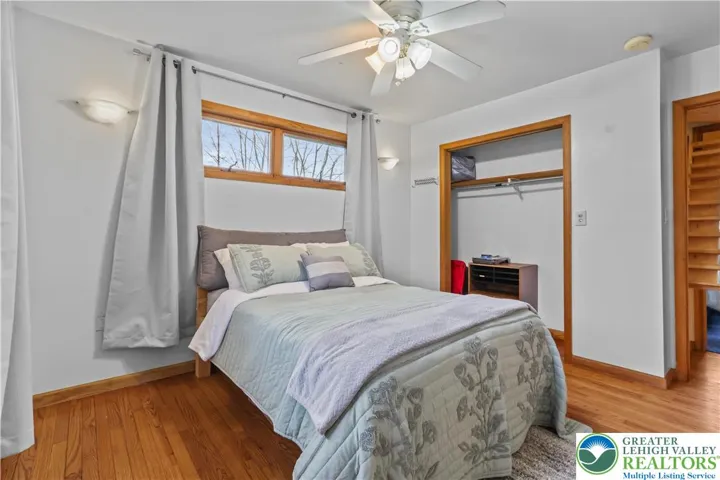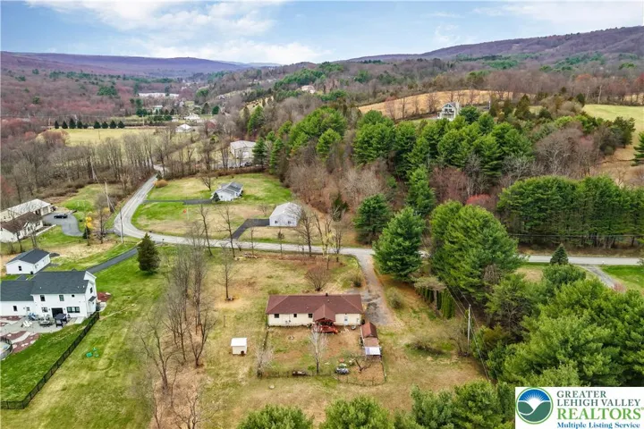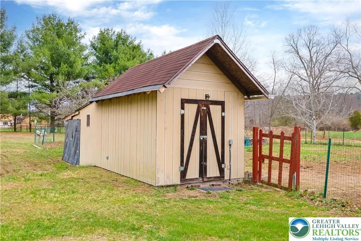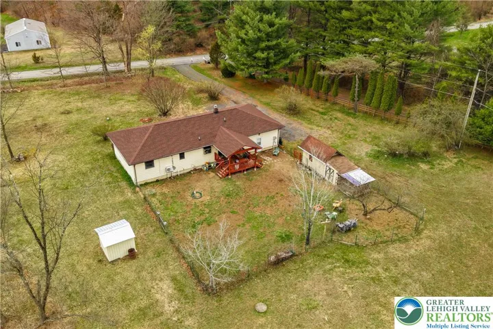 Enjoy ranch style living located in Ross Township situated in the Pleasant Valley School District. Appreciate the open concept with exposed beams/tresses in living room and kitchen complimented by hardwood floors. A brick wall in dining area has a flue ready for a cozy woodstove. A den/study offers a great opportunity for home office or space for some quiet time . Primary bedroom has private bathroom with relaxing sauna. 2 additional bedrooms and full bath complete this area. Laundry/mud room leads to over sized 2 car garage that has plenty of room for a workshop along with your cars. The double glass doors off the kitchen lead to the covered patio. The fenced yard area over looks the spacious 1.23 acre lot with a chicken "condo" and additional shed (seller currently have 4 chickens). The 2 mini split units cool the home as well as circulate heat. The roof, gutters and skylight were replaced in 2023. Low taxes complete the package! Close to major highways and the charm of the Poconos.