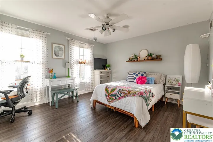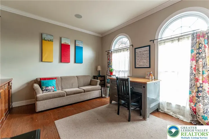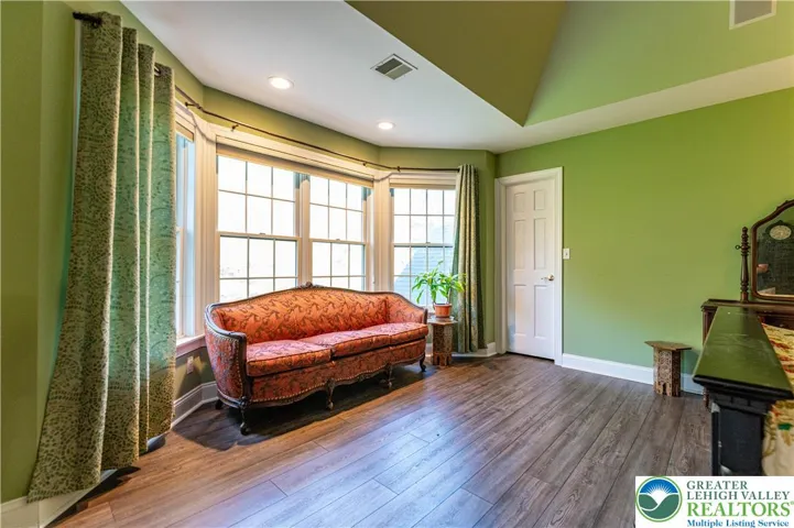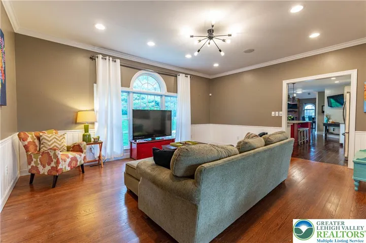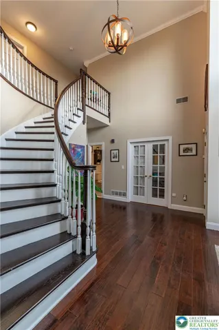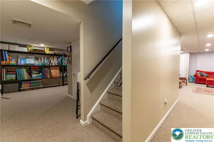 Welcome to this stunning Brick Front Tuskes Built Colonial Home with over 5,000 sq ft of refined living offers 4 bedrooms, 3.5 baths of a perfect blend of elegance and modern comfort, featuring hardwood floors and built-in speakers throughout. A grand 2-story central hall foyer welcomes you with a sweeping curved staircase and dual coat closets. The formal living room showcases refined baseboard and crown molding along with a striking floor-to-ceiling brick-front fireplace with mantel and accent spotlights, while the formal dining room is beautifully appointed with recessed lighting and classic wainscoting. The updated kitchen is a true showpiece, boasting granite countertops, a tiled backsplash, stainless steel appliances, hood vent, and an oversized center island with farmhouse sink, pendant lighting, and breakfast seating, along with a bright breakfast nook highlighted by a bump-out window. The impressive family room features a vaulted ceiling, another brick-front fireplace with mantel and spotlights, and a convenient bar area, while French doors open to a versatile home office/play room. Upstairs, double doors lead to the luxurious primary suite featuring a tray ceiling with fan, a cozy sitting area with bump-out window, and a spacious walk-in closet. The spa-like en-suite bath includes dual sinks in a granite-topped vanity, a freestanding soaking tub, a subway-tiled walk-in shower, and linen closets. Three additional generously sized bedrooms with ceiling fans share a full bath with dual sinks and a tub/shower combination. A second-floor laundry room and a finished loft sitting area which can be used for an additional home office area overlooking the family room add both convenience and charm. The fully finished basement expands your living space with wall-to-wall carpeting, recessed lighting, dedicated sitting and gaming areas, and double doors leading to a stylish wine room with tile flooring. A full bath with tile floors and a walk-in shower completes the lower level. Outdoors, enjoy a level backyard with panoramic views, a concrete patio perfect for entertaining, and a charming front sitting area beneath a trellis. A 3-car side-entry garage and paved driveway complete this exceptional home.