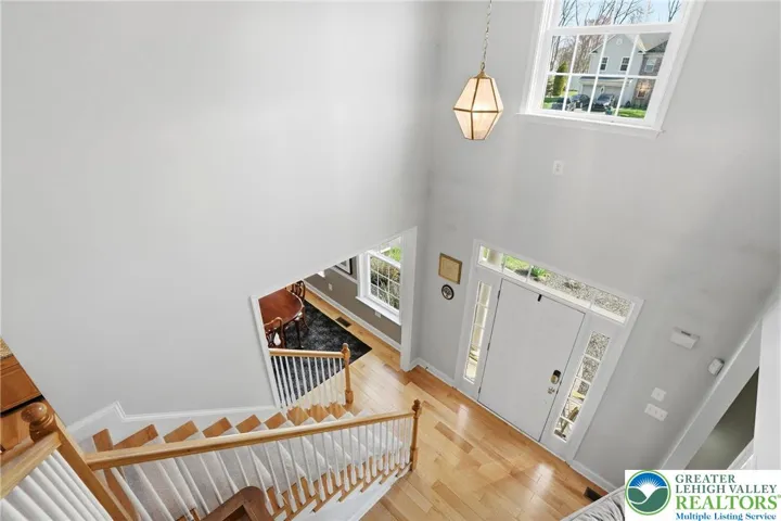 Step through the front door into an impressive two-story foyer where soaring ceilings, gleaming hardwood floors, and an elegant split staircase create a striking first impression. Flanked by the formal living room and dining room, the entry sets the tone for a home filled with natural light, refined finishes, and thoughtful design.