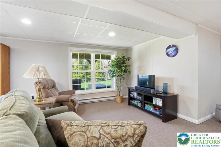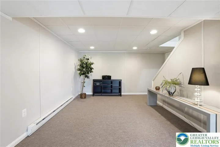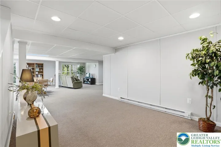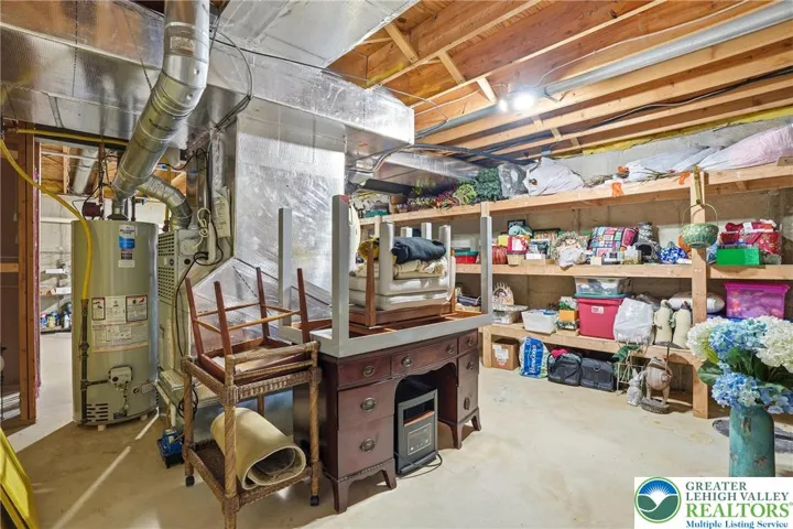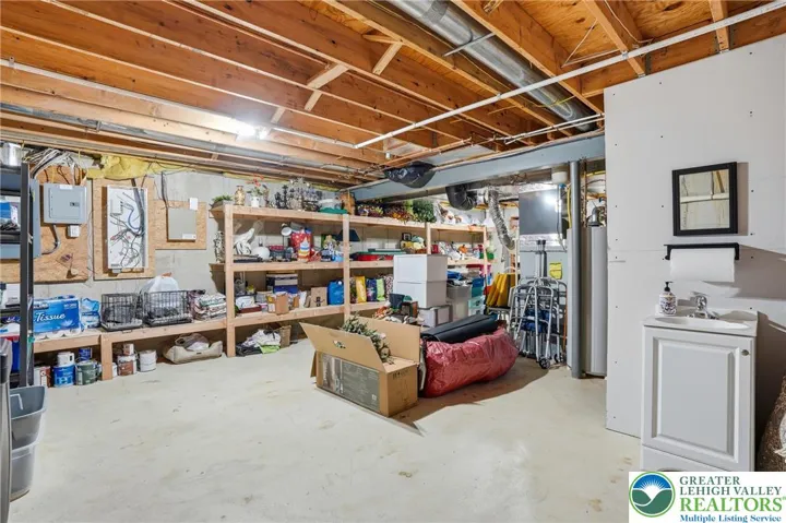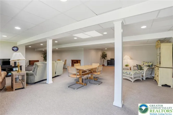The lower level adds valuable additional living space with room for movie nights, game tables, toy storage, or casual entertaining, along with direct access to the rear patios. The unfinished areas offer excellent utility, with exposed ceiling joists, concrete flooring, and built-in shelving for storage or workshop needs.