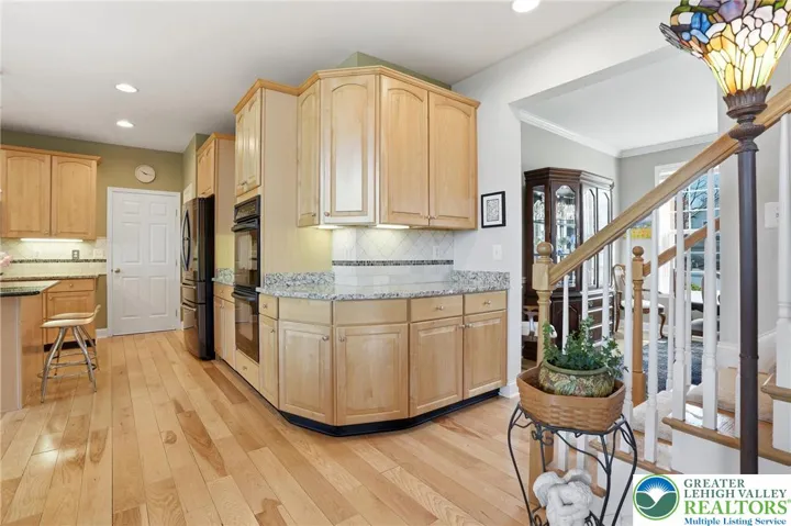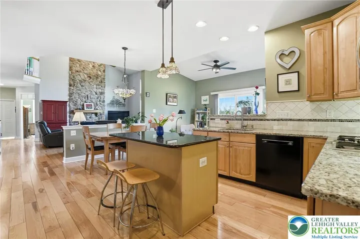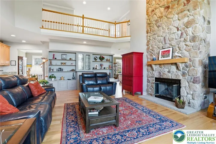 The bright, open kitchen features rich maple cabinetry, granite countertops, a diamond-pattern tile backsplash, stainless steel appliances, and a substantial center island with seating. It flows seamlessly into the breakfast area and the dramatic two-story family room, where a floor-to-ceiling stone fireplace, a wall of windows overlooking the private backyard, and a handsome wall of custom cabinetry create a warm and inviting gathering space. A second-floor overlook adds architectural interest and enhances the sense of openness.