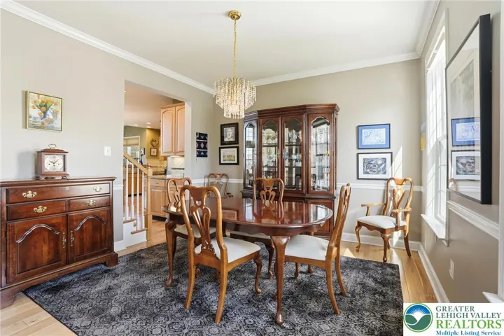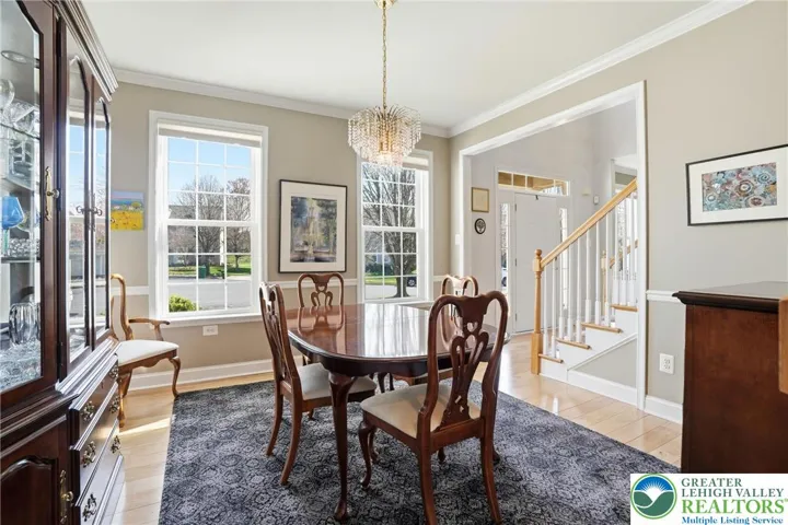 A private den or office offers a quiet workspace, while the conveniently located laundry room provides access to the backyard and garage. The formal dining room, complete with crown molding and a sparkling chandelier, is ideal for entertaining, while the open-concept living areas offer flexibility for both everyday living and special occasions.