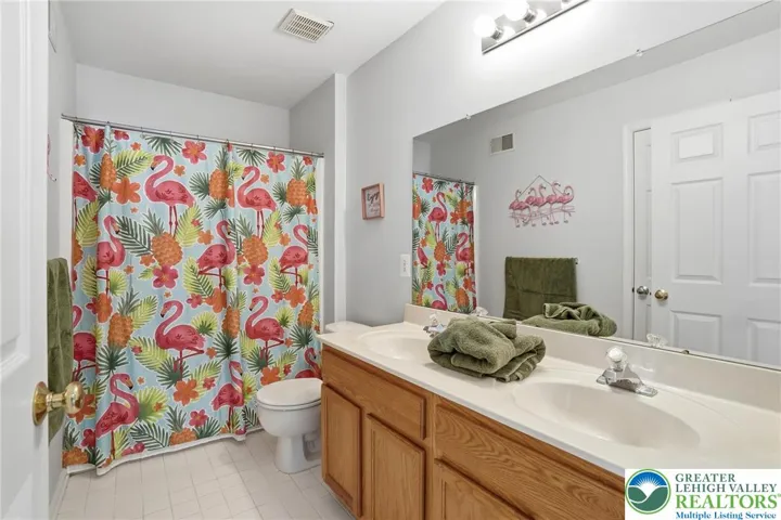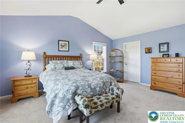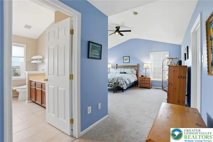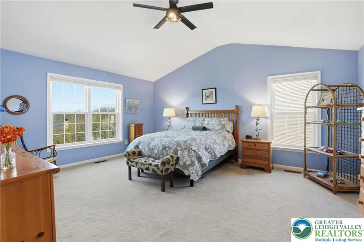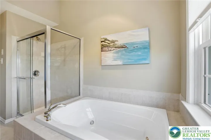 Upstairs, the spacious primary suite features a cathedral ceiling, two walk-in closets, and a private en-suite bath with dual vanities, a Jacuzzi jetted tub, and a separate shower. Additional bedrooms offer bright windows, classic white trim, and distinctive color palettes, creating comfortable and personalized retreats. Well-appointed bathrooms throughout the home include tasteful tilework and practical layouts, along with a convenient powder room on the main level.