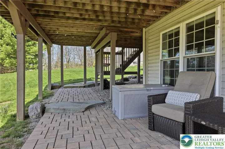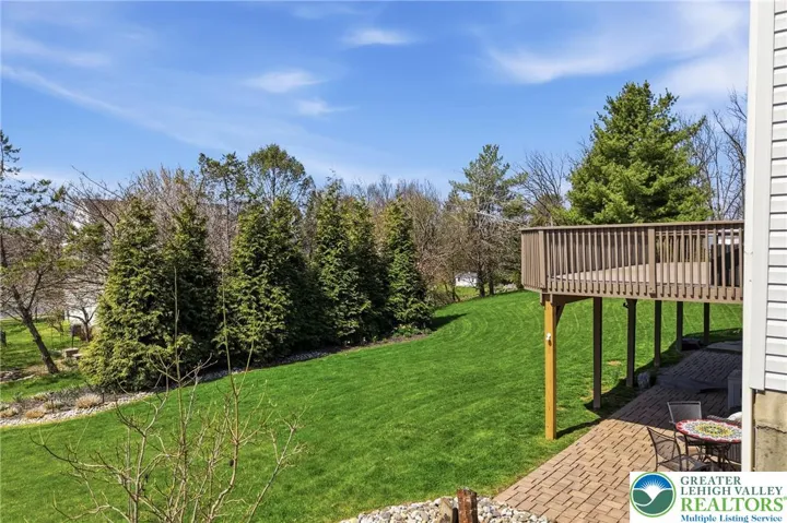 Outdoors, a multi-level wraparound deck with vertical picket railings extends the living space and captures scenic views of the rolling landscape. Below, a sheltered paver patio with herringbone brick detail and river rock landscaping creates a welcoming outdoor retreat, complete with a fire pit area and thoughtfully landscaped grounds. The gently sloping backyard, mature trees, and lush lawn provide privacy and a peaceful setting for relaxing or entertaining.