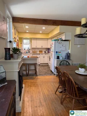 This home is full of character and awaiting your extended family. This home offers a true mother-daughter or will accommodate a large family. Located in the heart of Portland on a corner lot that has a fenced in backyard with a new patio with firepit. Great for the kids, pets or family gatherings. Home offers first floor living with (3) bedrooms, full bath, living room and huge kitchen with formal dining area. There is a separate staircase that accesses the upstairs living area. This area also has a private entrance if needed. Upstairs offers a full kitchen, living room, and (2) bedrooms! Both floors offer 10 ft ceilings and original bannisters and plaster walls. Covered porches (2), patio and amazing yard make outside entertaining perfect! Newer upgrades include, (2) year old furnace, roof 2023, replacement windows, blown in insulation, reverse osmosis water system, paved driveway and lots more. Walk to town and enjoy the views of the Delaware Water Gap from the walk bridge or the convivences of town. Rt 80 is 1 mile making this an easy commute to anywhere! This home offers a lot of potential as it has been well maintained and has lots of space to make it your own!!
