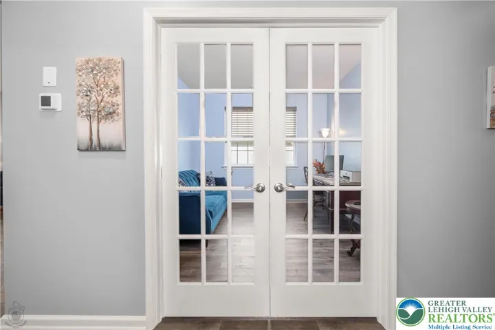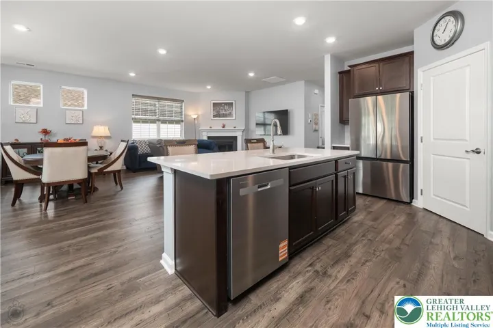 The bright, gourmet kitchen is the heart of the home, featuring an oversized island, abundant counter space, quartz countertops, stainless steel appliances, and a convenient butler’s pantry. The laundry room with a utility sink is thoughtfully located just off the kitchen.