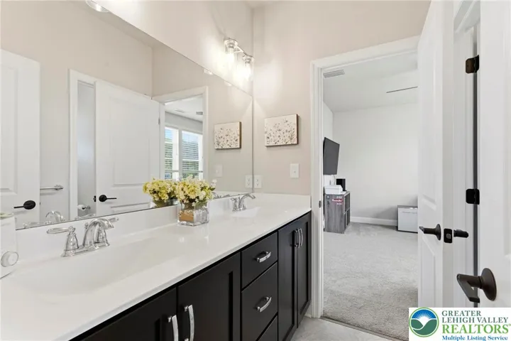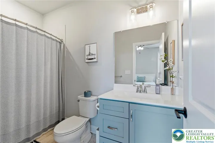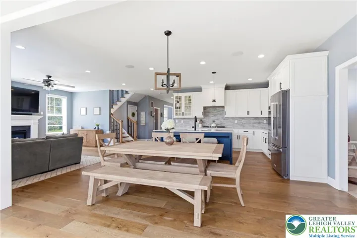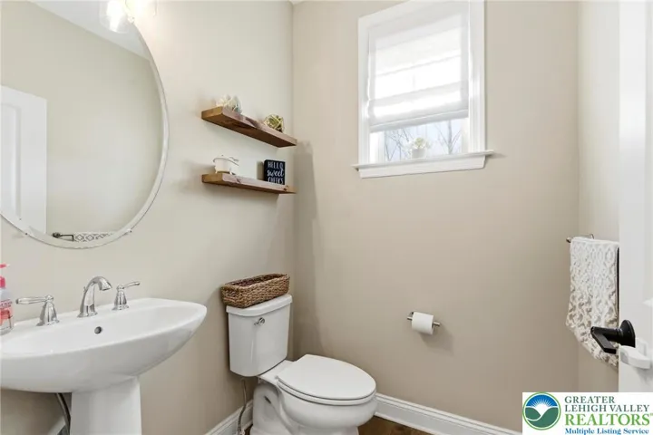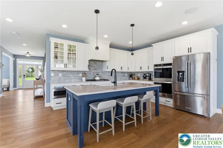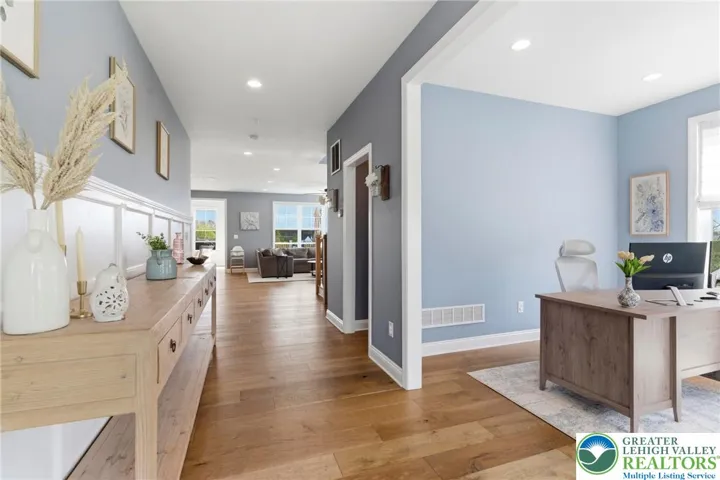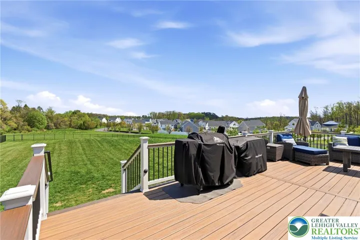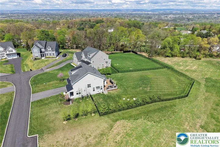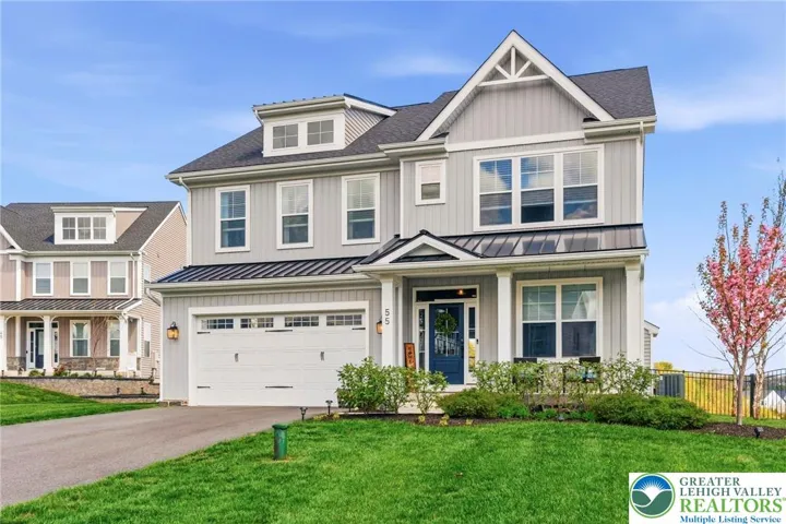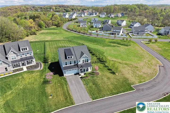 Set in the rolling countryside of Williams Township, this newer 4-bedroom, 3.5-bath modern farmhouse-style colonial offers a rare combination of style, space, and scenic views. Thoughtfully positioned within the neighborhood, the home captures sweeping mountain views from the backyard. Inside, a bright and open floor plan is enhanced by 9-foot ceilings on all levels and engineered hardwood flooring throughout the main floor. The welcoming entry foyer is flanked by a light-filled office, ideal for working from home or flexible use. The main living area flows seamlessly into a well-appointed kitchen designed for both everyday living and entertaining, featuring stainless steel appliances, quartz countertops, 42 inch cabinets, a double oven, and an oversized center island with seating. The kitchen opens to a spacious dining area and sunroom, where natural light and backyard views create an inviting atmosphere. The living room is anchored by a gas fireplace, while a functional mudroom with two closets connects the garage to the home. A powder room completes the first floor. Upstairs, generously sized bedrooms each include walk-in closets, and ceiling fans, offering both comfort and storage. The primary suite features two walk-in closets and a well-designed bathroom with a dual sink quartz vanity, soaking tub, and large walk-in shower. A secondary bedroom includes its own en suite bath, while the remaining two bedrooms share a thoughtfully designed "Jack-and-Jill" set up sharing a full bathroom with a double vanity and separate tub/shower and toilet area. Outdoor living is a highlight, with a rear deck overlooking the fenced backyard and capturing impressive mountain views—an uncommon feature in this neighborhood. The full basement, complete with an egress window, offers excellent potential for future finished living space. Combining modern design with a peaceful setting, this home offers the best of country living with convenient access to New Jersey for commuting and amenities.