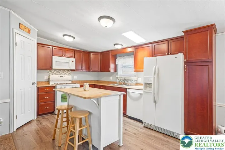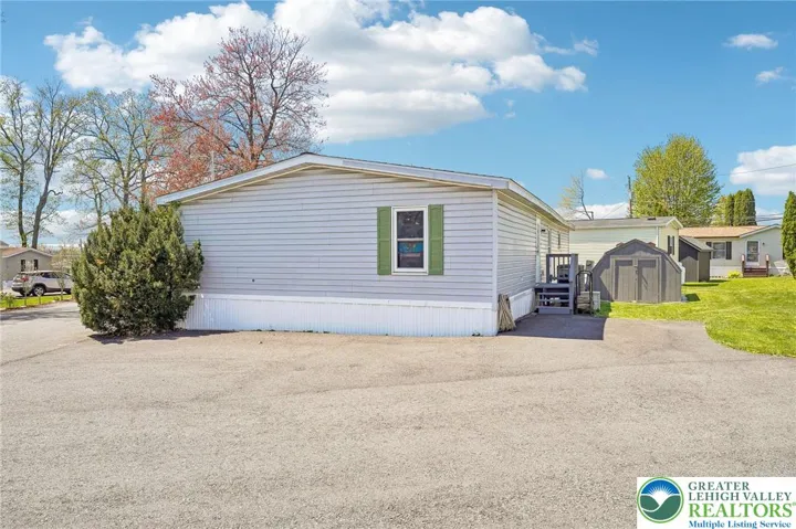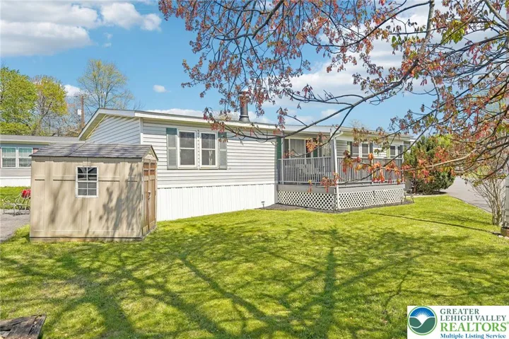 Welcome to this cozy and well-maintained double-wide mobile home in Red Maple Acres Park, offering a comfortable, open layout with thoughtful updates throughout. Enter from the large covered front porch, ideal for relaxing or enjoying the outdoors in a sheltered setting, into the inviting living room. This area features a classic brick wood-burning fireplace, creating a warm and welcoming focal point. Just off the main living area, a versatile bonus room provides flexible space for a family room, den, home office or potential fourth bedroom. The kitchen and dining area, with updated Pergo flooring installed in December 2025, flow easily, making everyday living and entertaining convenient. The primary bedroom offers a private split layout retreat with a walk-in closet and its own full bathroom ensuite. Two additional spacious bedrooms are located on the opposite side for added privacy, and provide comfortable accommodations and flexibility. They are serviced by the updated full hall bathroom. A decided laundry room provides access to the rear and the washer and dryer are included for added convenience. Exterior features include two sheds, one of which has been recently rebuilt, offering excellent storage or workspace options. A new roof was installed in September 2025 which provides added value and peace of mind. Red Maple Acres is a well-maintained community with easy access to local schools, shopping, and is close to Dorney Park. With its combination of updates and flexible living space, this home presents a great opportunity for comfortable everyday living.