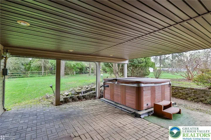 Enjoy outdoor living under the large covered patio where the hot tub remains, creating a private setting for relaxation year-round. The detached garage features two bays that are double deep, providing space for up to four vehicles, recreational equipment, or a workshop.