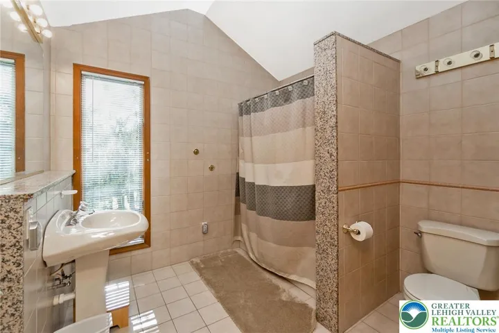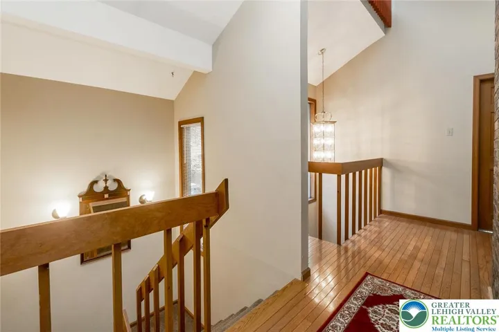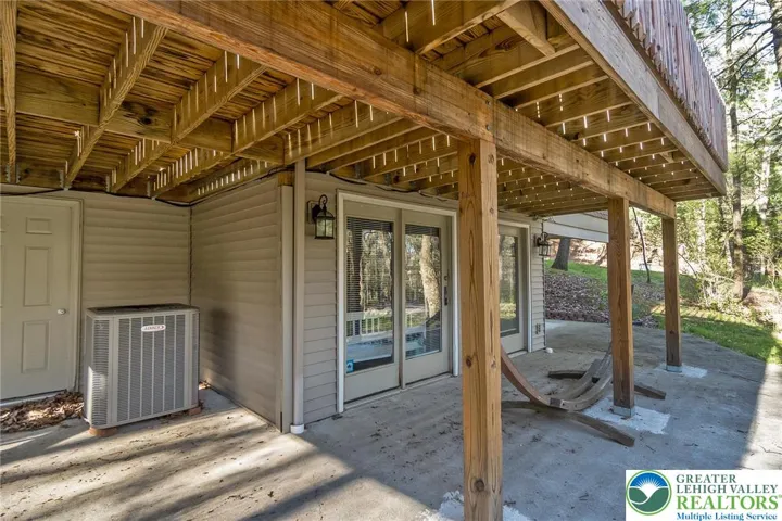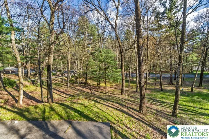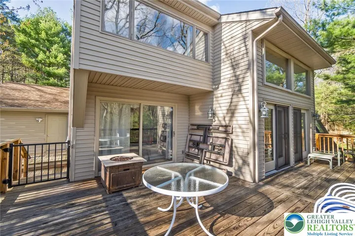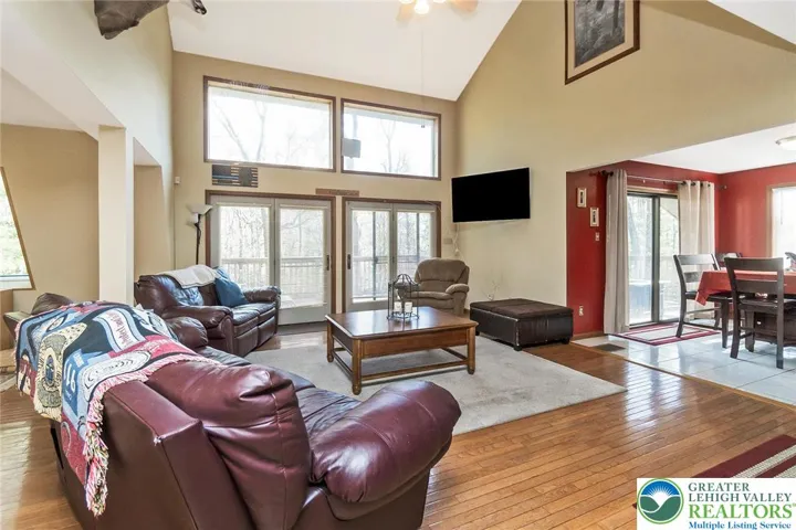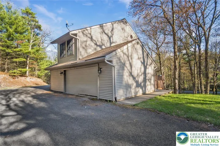 Contemporary home located in the highly desirable Little Gap Estates community, just minutes from Blue Mountain Resort. Situated on a private 1-acre wooded corner lot, this very unique property offers approximately 2,300 above grade square feet of living space and is well-suited for a primary residence, vacation home, or potential investment opportunity. The main level features a dramatic two-story great room with soaring ceilings, abundant natural light, and a wood-burning fireplace that serves as the focal point of the space. Adjacent to the great room is a separate family room enhanced by skylights, providing additional living space and a bright, open feel. The layout flows into the dining area and kitchen, creating a functional setup for both everyday living and entertaining. The second floor offers a primary bedroom suite complete with cathedral ceilings, creating a spacious and inviting retreat. In total, the home features 4 bedrooms and 3.5 bathrooms, offering flexibility for a variety of living arrangements. The lower level adds significant additional living space, including a second family room featuring a wood stove and glass doors leading to the exterior, creating a warm and inviting space with direct outdoor access. An additional bedroom with a private full bathroom is also located on this level, ideal for guests or extended stay living. Outdoor features include a large wraparound deck, lower patio, and a peaceful wooded setting that offers both privacy and a true Pocono-style atmosphere. Located just minutes from Blue Mountain Resort for year-round recreation including skiing, hiking, and outdoor activities. Conveniently positioned near Route 248, Route 209, and the PA Turnpike Northeast Extension (I-476), offering easy access to the Lehigh Valley and surrounding areas. This property presents a great opportunity for a full-time residence, second home, or potential short-term rental (buyer to verify township regulations).
