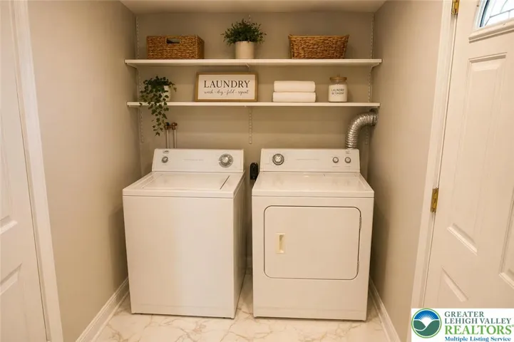 The primary bedroom (13x11) is also located on the main floor for added convenience, along with a second bedroom that works perfectly as a guest room, nursery, or home office. The full bathroom features an updated vanity with granite top and a tub/shower combo. The dedicated laundry room with full-size in-unit washer and dryer is a genuine rarity in this market — no coin laundry, no shared machines, no trips to the laundromat.