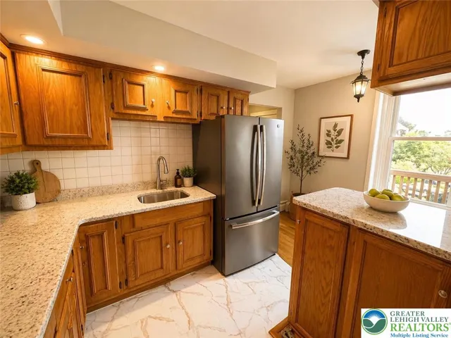 The first floor sets the tone immediately. A large living room (nearly 15x14) anchors the space with gleaming hardwood floors and a sweeping bay window that floods the room with natural light. The kitchen has been tastefully updated with solid oak cabinetry, granite countertops, a marble-look tile floor, and a stainless French door refrigerator — stylish without being precious. A dedicated dining area connects the kitchen to the living space, creating an easy flow for everyday living and entertaining.